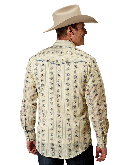 Mens Long Sleeve Snap Floral Stripe Western Shirt With Solid Piping On Front - 01-001-0086-0351 Ye