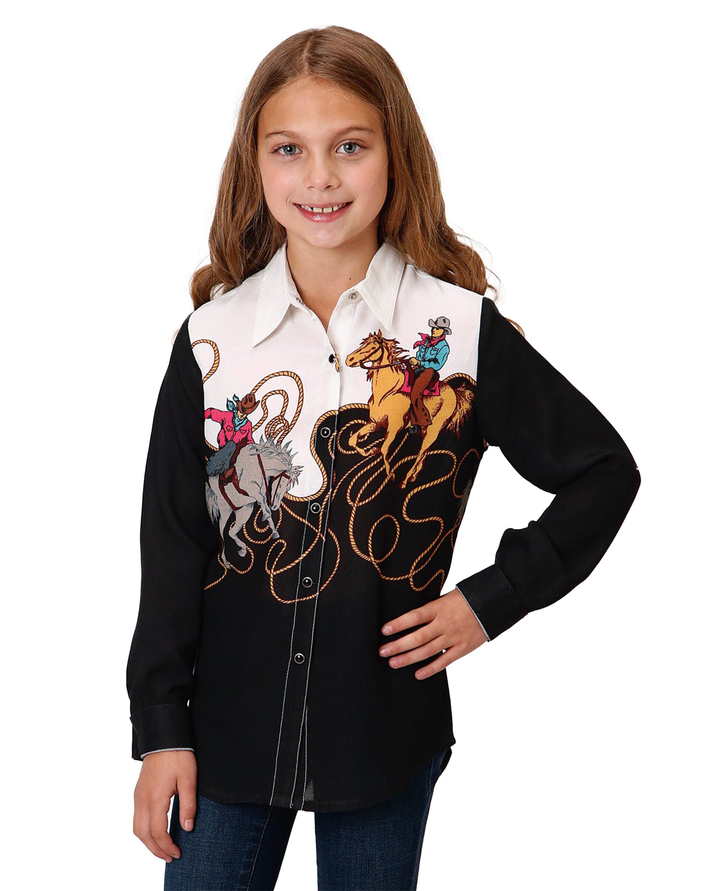 Expertly crafted with high-quality materials, this retro border printed rayon long sleeve western blouse is both stylish and durable. The snap closure adds convenience while the eye-catching design is sure to make a statement. Perfect for any fashion-forward young girl, this shirt is a must-have for any wardrobe.