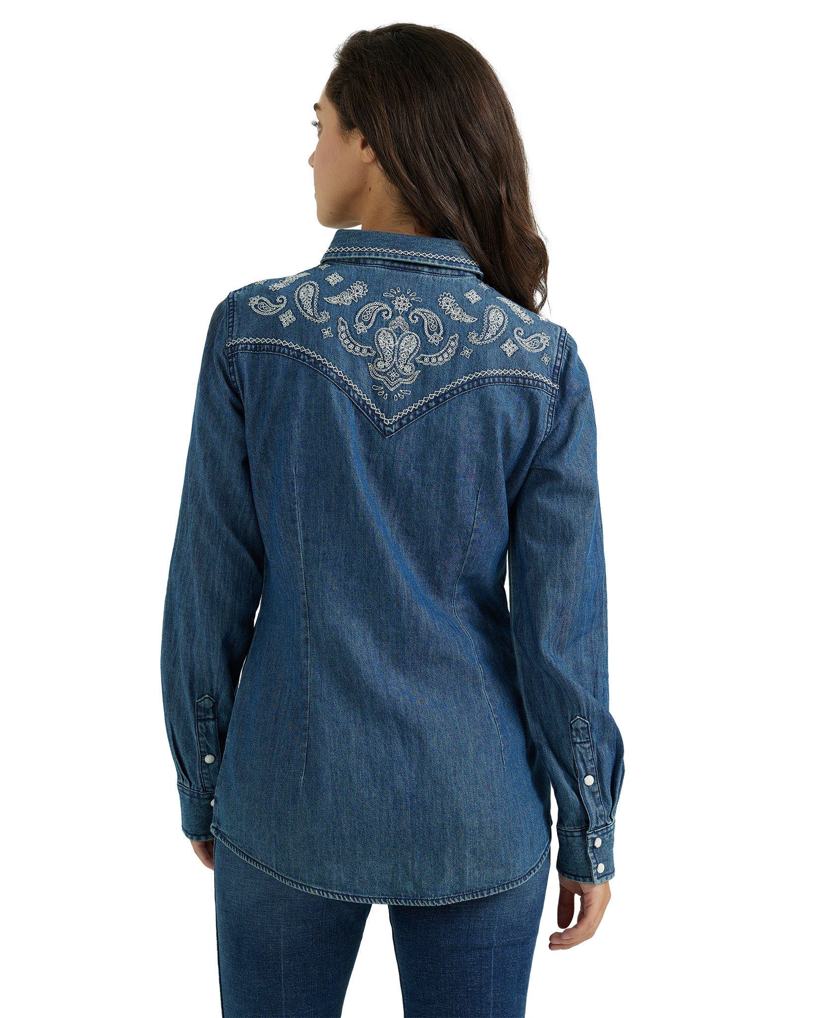 This Women's Retro Punchy Long Sleeve Western Shirt combines classic western style with detailed craftsmanship. Made from 100% cotton, it offers breathable comfort and durability for everyday wear. The shirt features intricate embroidery on both the front and back yoke, adding a distinctive vintage flair. Practical design elements include two flap chest pockets secured with snaps, three snap cuffs for adjustable fit, and a snap front closure for easy wear. Perfect for those seeking authentic western attire with a refined, expert touch.