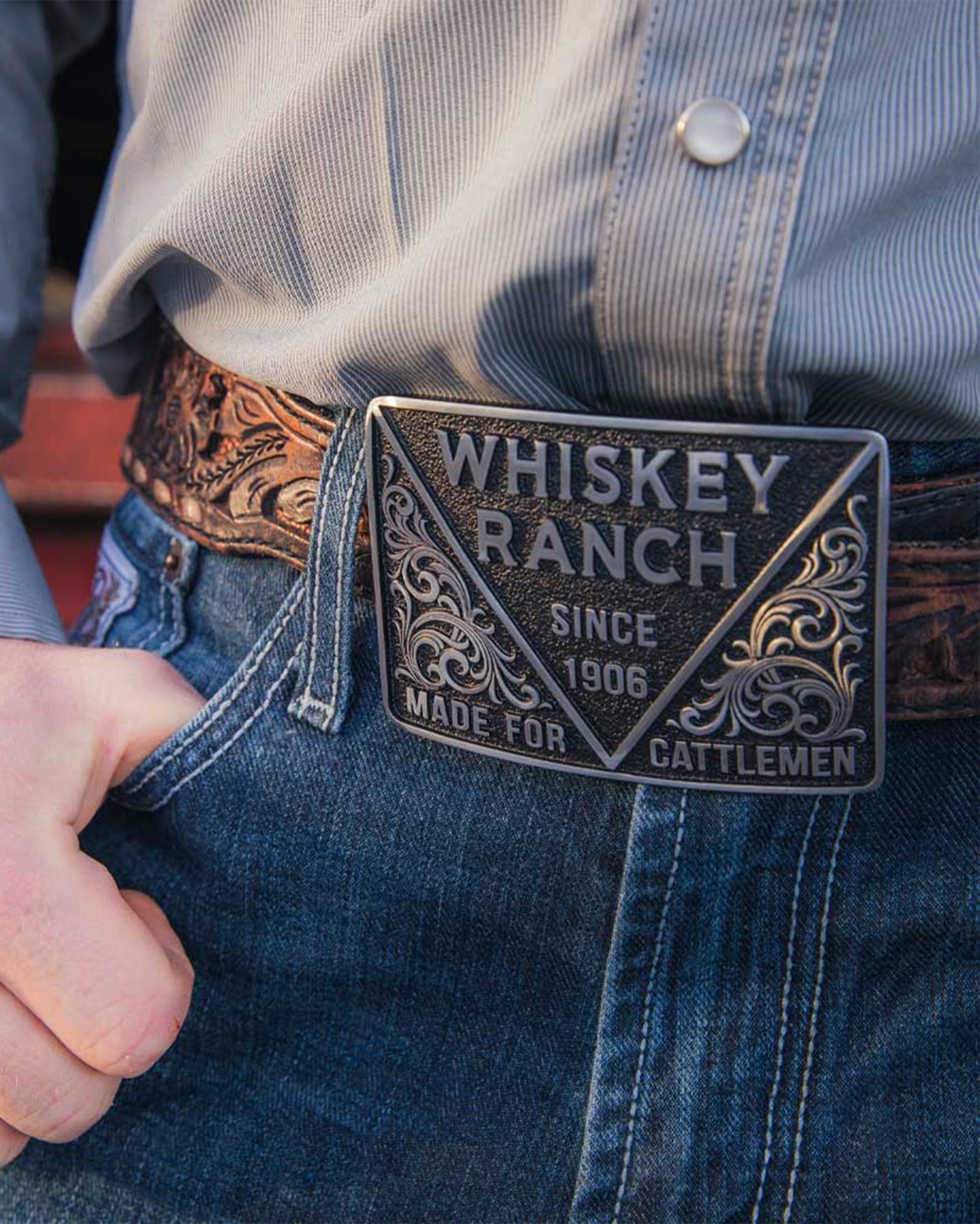 Designed specifically for cattlemen, this square buckle showcases silver-tone details against a dark background. The centerpiece displays the bright silver-tone inscription "Whiskey Ranch Since 1906." Ornate silver-tone filigree on each side enhances its Western character, while the phrase "Made for Cattlemen" is engraved at the bottom.