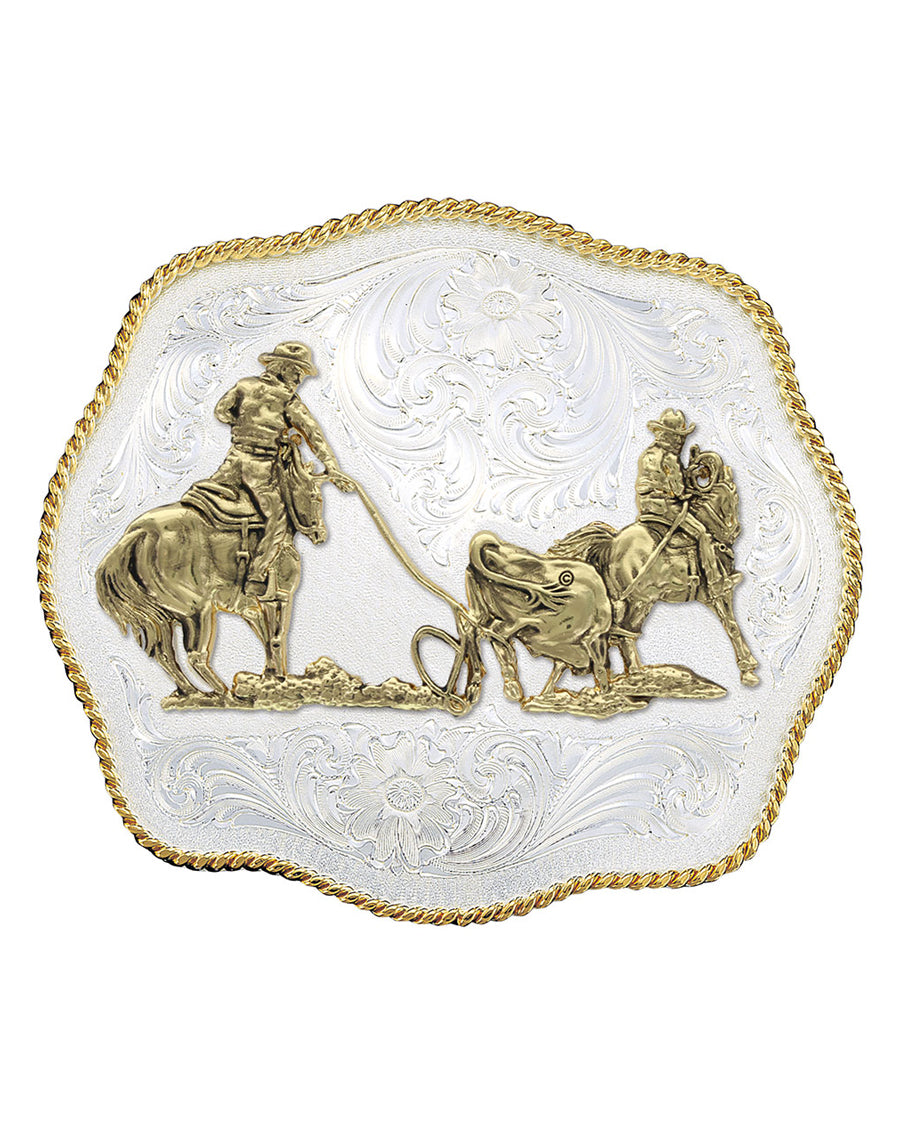 Silver scalloped shaped belt buckle with gold twisted rope trim applied around the edge. The silver with engraved in classic western style bright cut floral filigree with two large flower accents surround a large gold figure of team ropers and a calf. Standard 1.5" belt swivel.