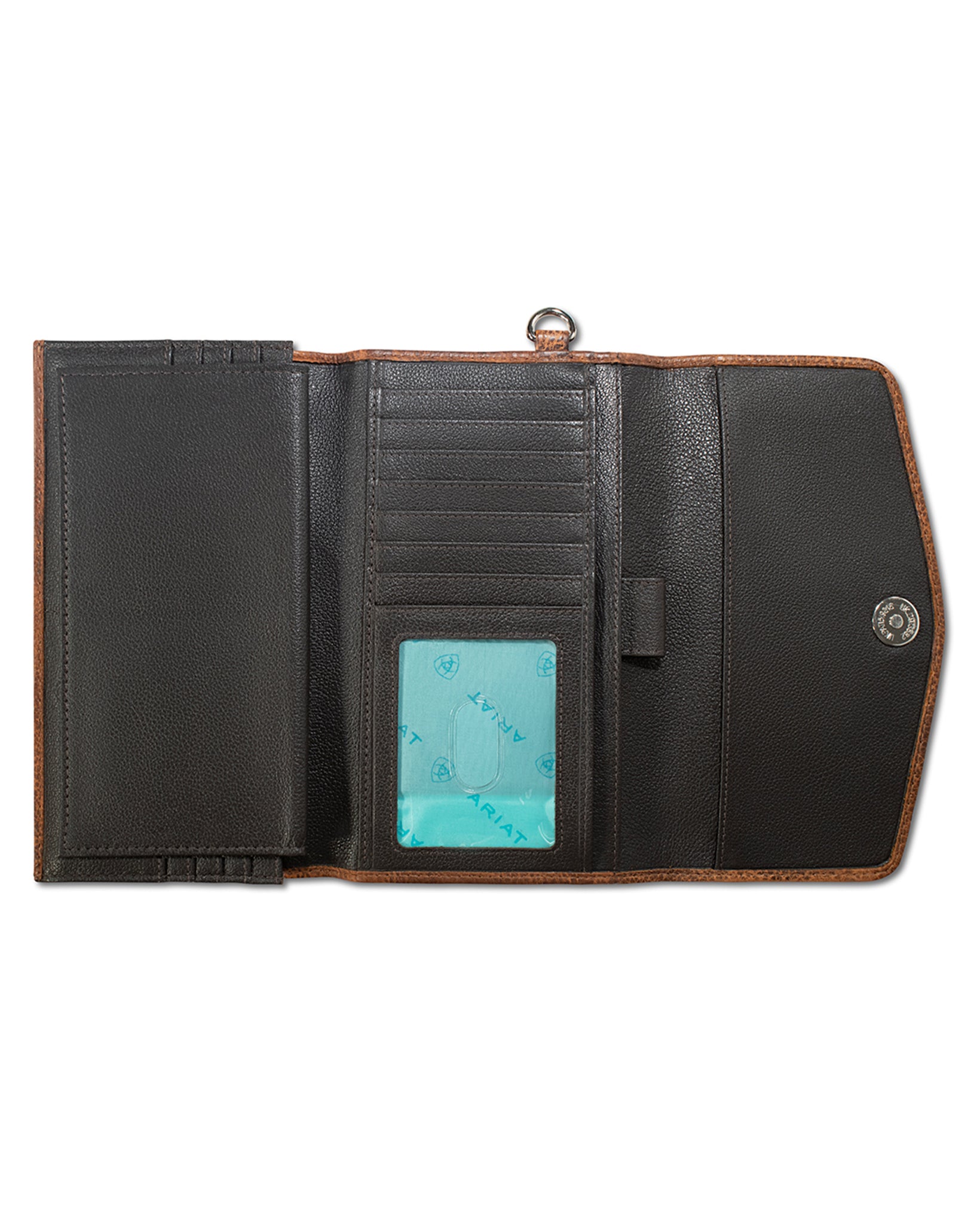 This compact satchel from the Betsy line features a richly distressed leather construction paired with a magnetic closure adorned by an antique copper concho embellished with white stones. The interior is thoughtfully organized with dedicated compartments for cards, currency, identification, checks, and writing instruments—ideal for those who value both style and functionality in their everyday carry.