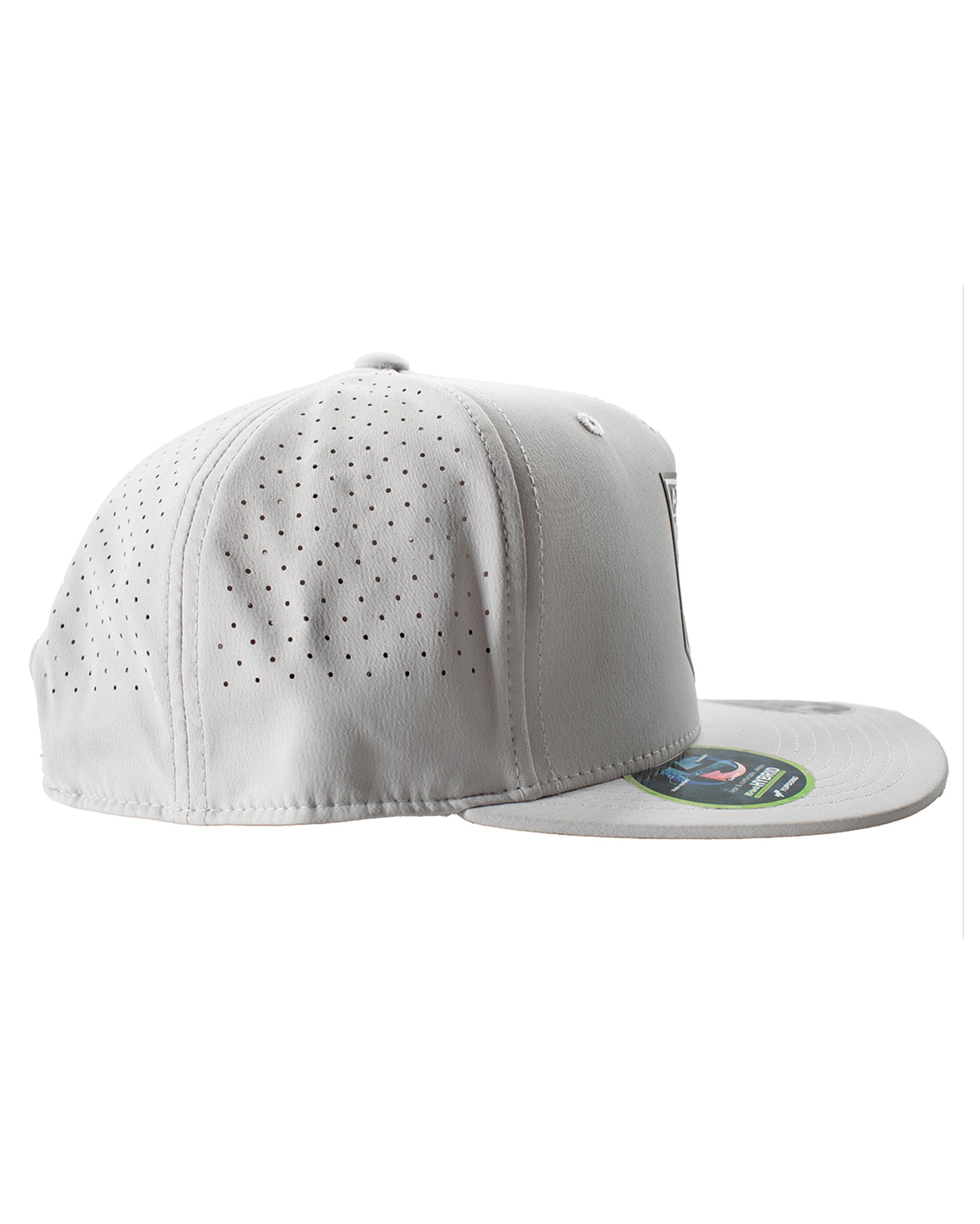 Ariat men's FlexFit 110 cap features a sophisticated grey front panel and bill, complemented by a distinctive black and white rubber Ariat patch. This premium headwear offers technical performance with water-repellent treatment, superior breathability, and moisture management properties. The grey performance mesh back enhances ventilation, while the snapback closure system ensures customized comfort and fit precision.