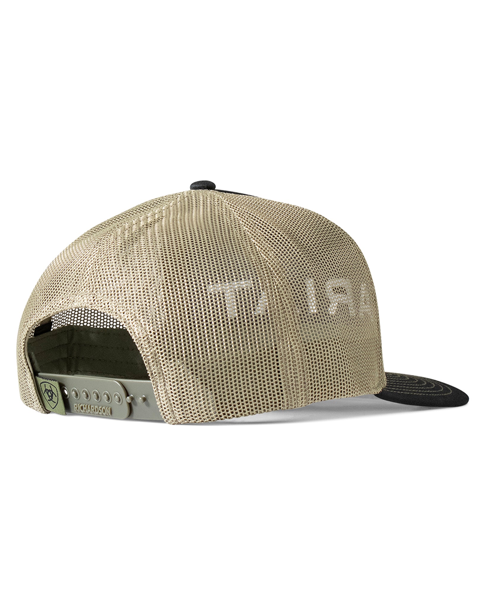 This Ariat men's cap features a black fabric front with green stitching on both the front panel and bill. The front showcases a raised Ariat logo embroidered in a distinctive green and yellow southwest design. The cap includes a green mesh back and an adjustable snapback closure to ensure a comfortable, customized fit.
