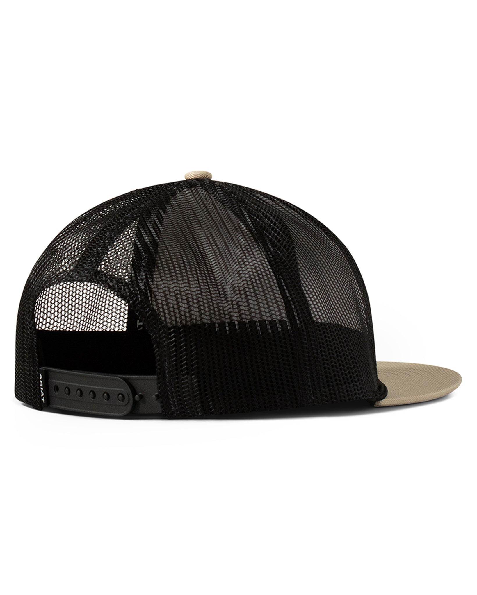This Ariat flat brim cap from M&F Western Products features khaki fabric on the front panels and bill, accented by an orange and white embroidered Ariat patch showcasing a desert scene. It includes a black rope trim along the brim and a black mesh back with an adjustable snap closure to ensure a comfortable, customized fit.