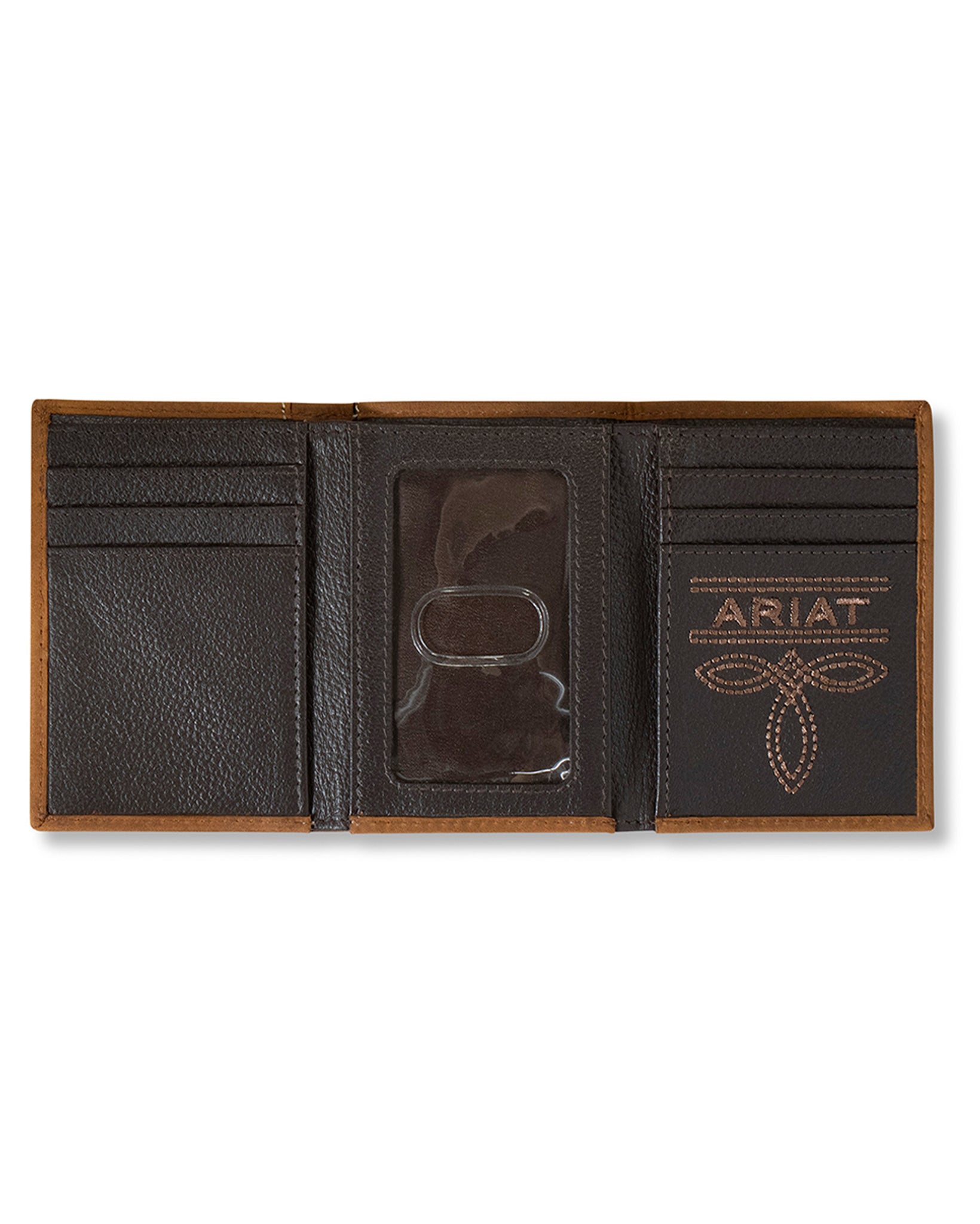 Crafted from premium two-tone brown leather, this Ariat trifold wallet features the distinctive Ariat branding embossed on the upper right corner. Its streamlined profile combines durability through reinforced stitching with practical organization, offering multiple card slots and a transparent identification compartment.