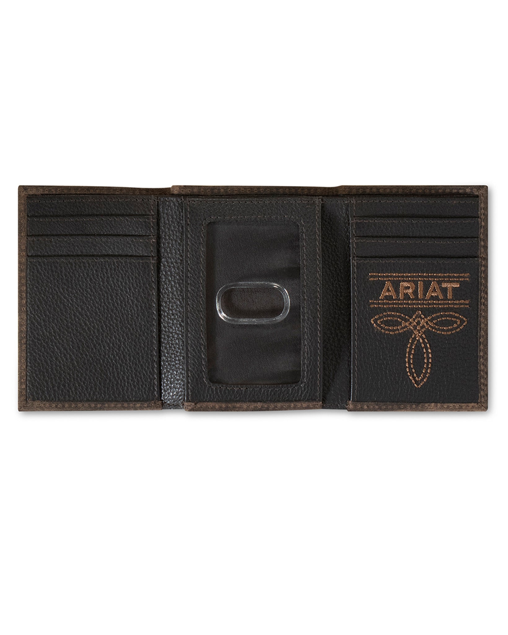 Crafted from authentic brown crazy horse leather, this Ariat trifold wallet features the Ariat name embroidered in cream and the logo outlined in dark brown on the exterior. The interior is equipped with multiple credit card slots and a transparent ID window for practical organization.