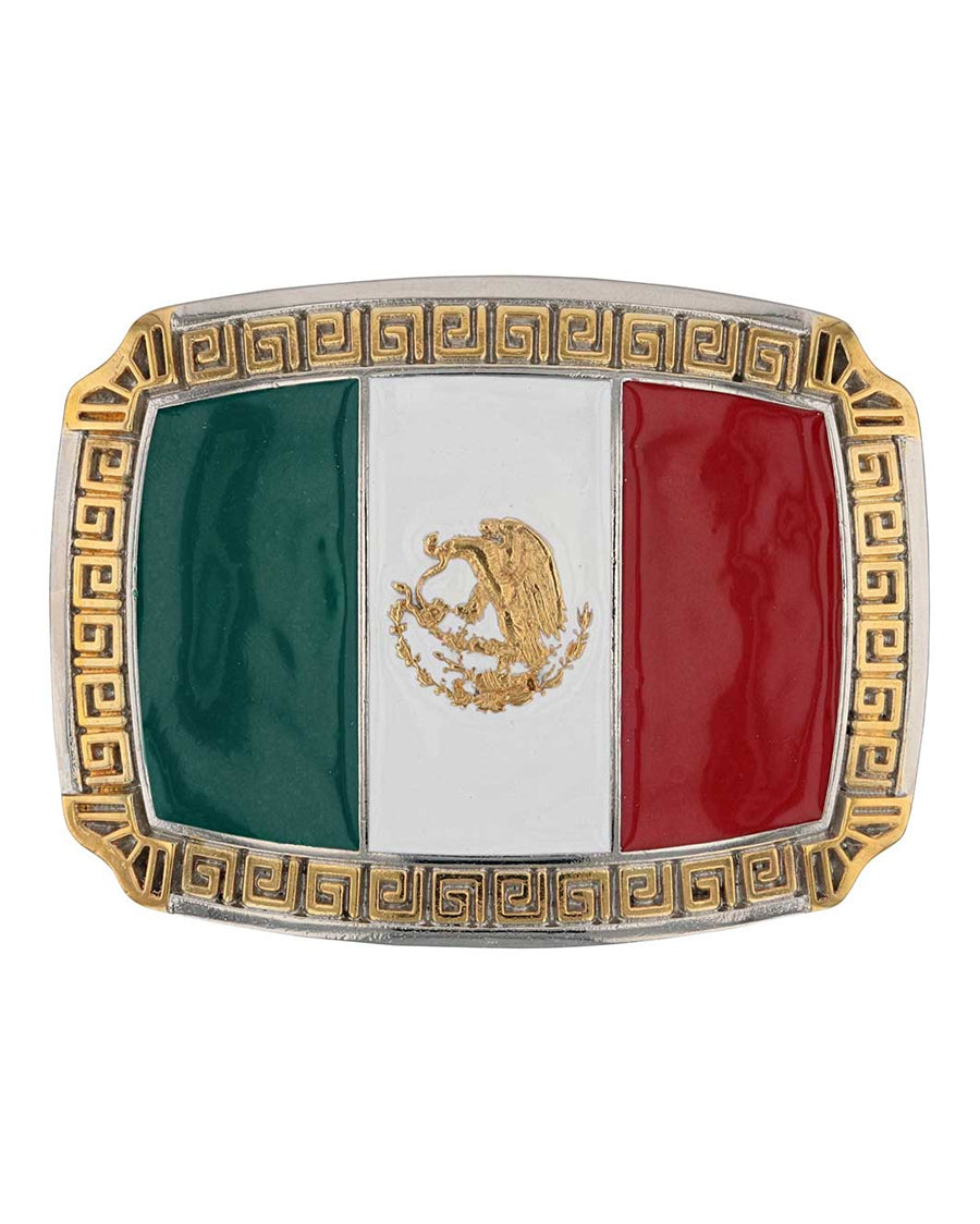 The bold colors of the Mexican flag shine brightly from the Pride of Mexico Attitude Buckle. Over the colors is the national emblem of a Mexican eagle upon a prickly pear devouring a rattlesnake in a gold finish. The rectangular buckle has clipped corners and a gold tone geometric border around the entirety. This marvelous buckle is a great display of Mexican pride and heritage. Standard 1.5 inch swivel.