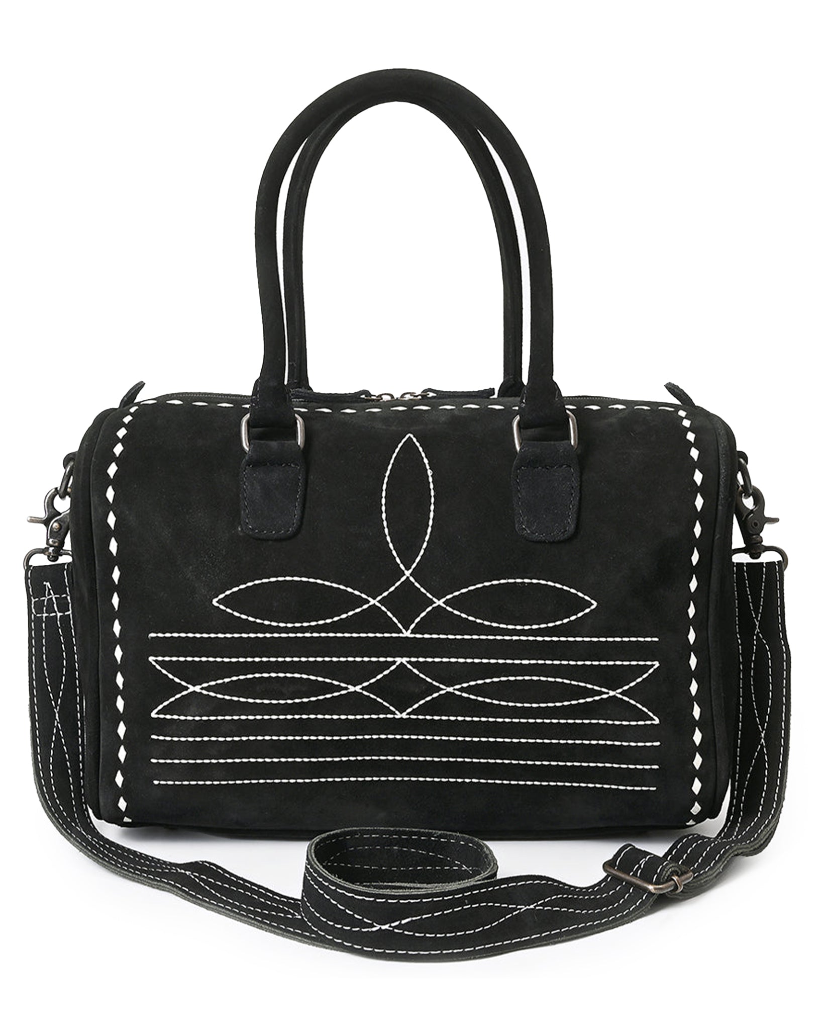 Sleek, structured, and full of Western attitude, this black suede duffel-style handbag is the perfect everyday carry or weekend companion. Featuring bold white hand-stitched embroidery in a geometric motif, it blends utility and style with top handles and a removable shoulder strap for versatility. Lightweight yet spacious, this bag offers a rugged elegance perfect for travel, daily use, or rodeo-ready fashion.