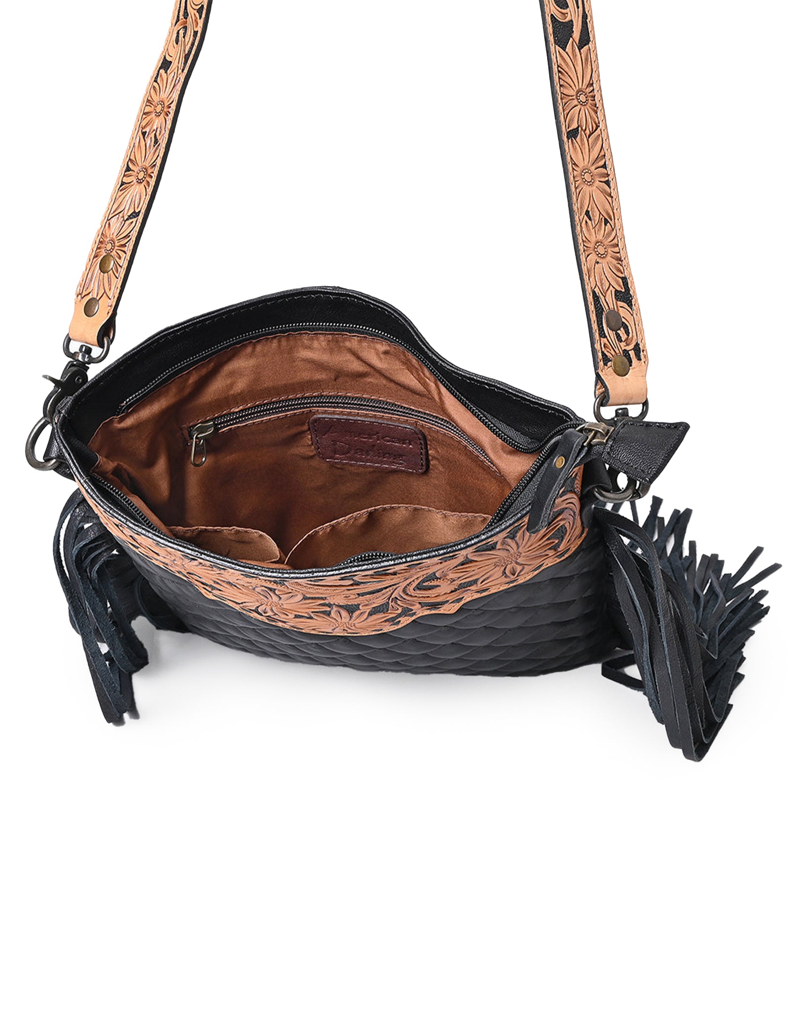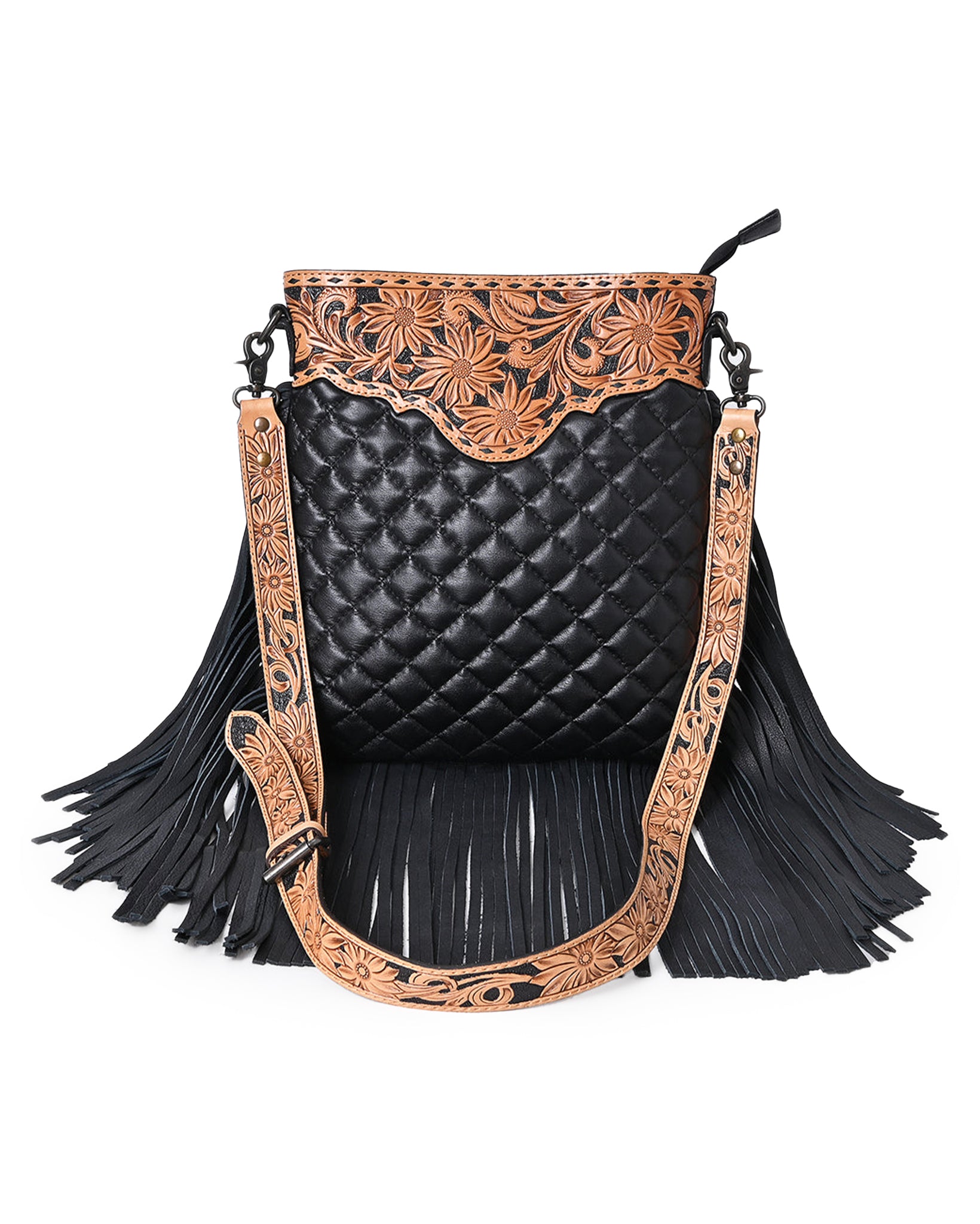 Embody Western sophistication with this expertly crafted black quilted fringe crossbody bag from American Darling. Tailored for the adventurous cowgirl, it showcases a luxurious black quilted leather body, detailed floral hand-tooled leather yoke, and an adjustable strap featuring matching tooling. The long black fringe accents the sides, creating dynamic movement and a striking presence at rodeos, concerts, or casual weekends. Combining ample space with refined style, this bag exemplifies true Western artistry fused with premium fashion sensibility.