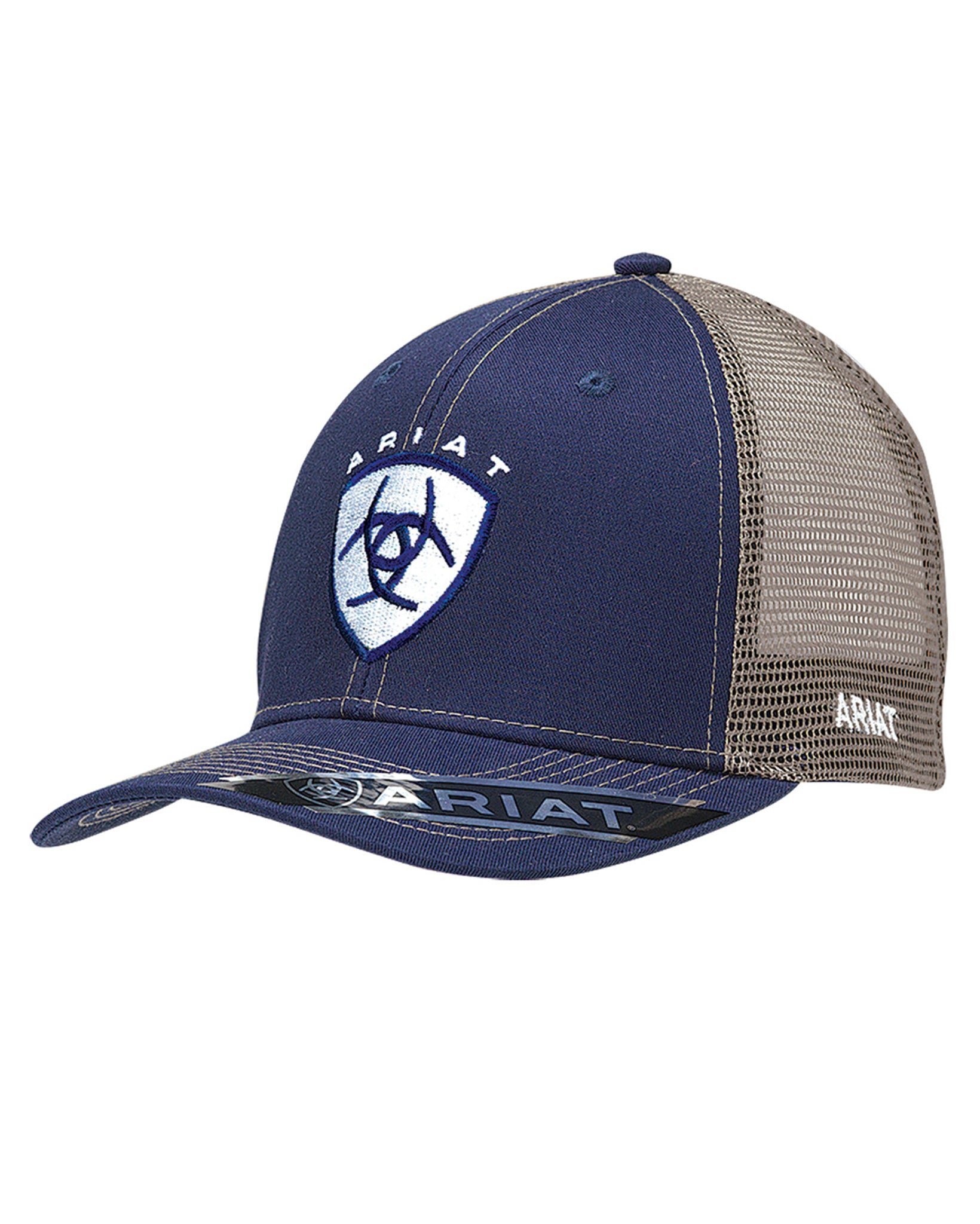 Expertly crafted for comfort and style. This Ariat men's cap by M&F Western Products® boasts a navy brim and bill, perfectly accented with a centered Ariat shield and text logo. The tan contrast stitching and mesh snapback add a touch of versatility and functionality. Designed with quality in mind, this cap is sure to impress.