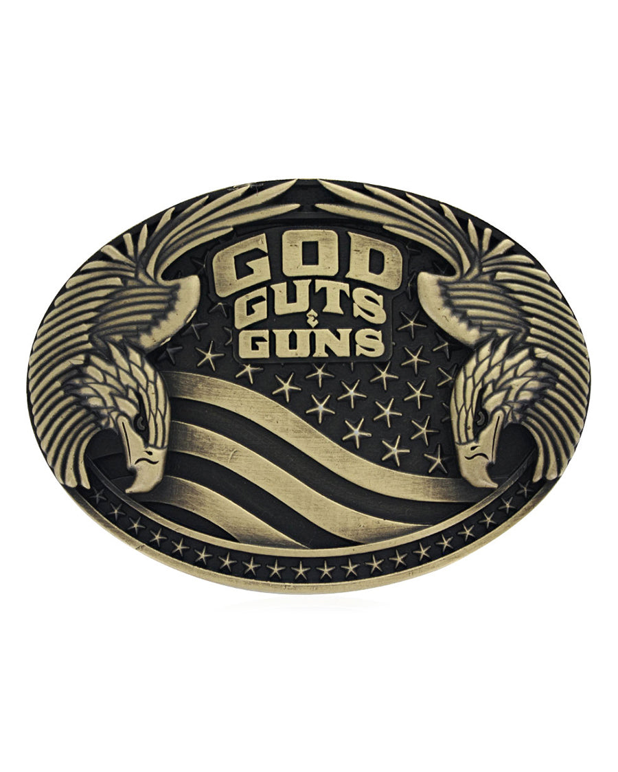 - American flag that flows in the background with the three words "God, Guts, & Guns"