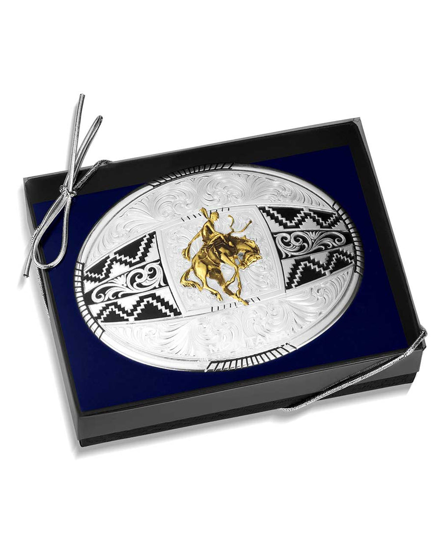 Built for those who live for eight seconds of glory. At the heart of this buckle is a striking bronc rider surrounded by black Southwestern style patterns, adding rich contrast and cultural flair. Standard 1.5 inch belt swivel.