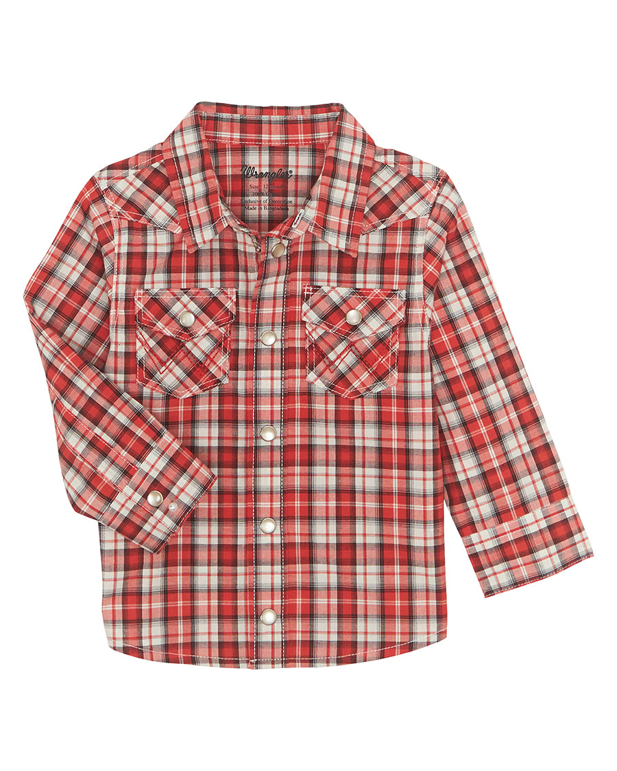 He may be a few years away from becoming a rodeo rider, but it's never too early to introduce them to cowboy culture. This miniature Western snap shirt combines the authentic Wrangler® style of the originals you love with features that are perfect for your mini-me. Its Western yokes and cuffs, classic plaid pattern, and snap flap pockets with our iconic 'W' stitching are just what your little man needs to get ready for the cowboy lifestyle.