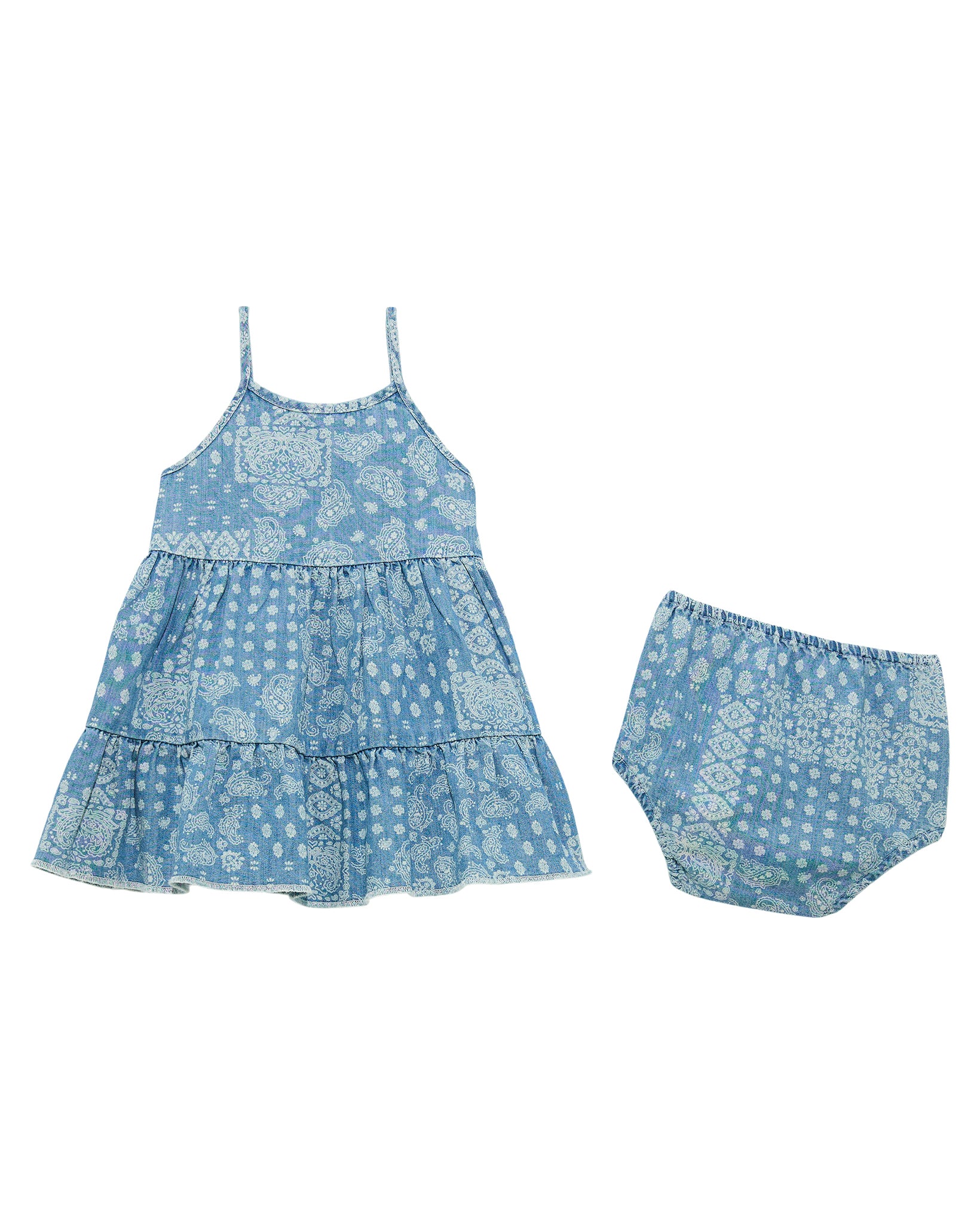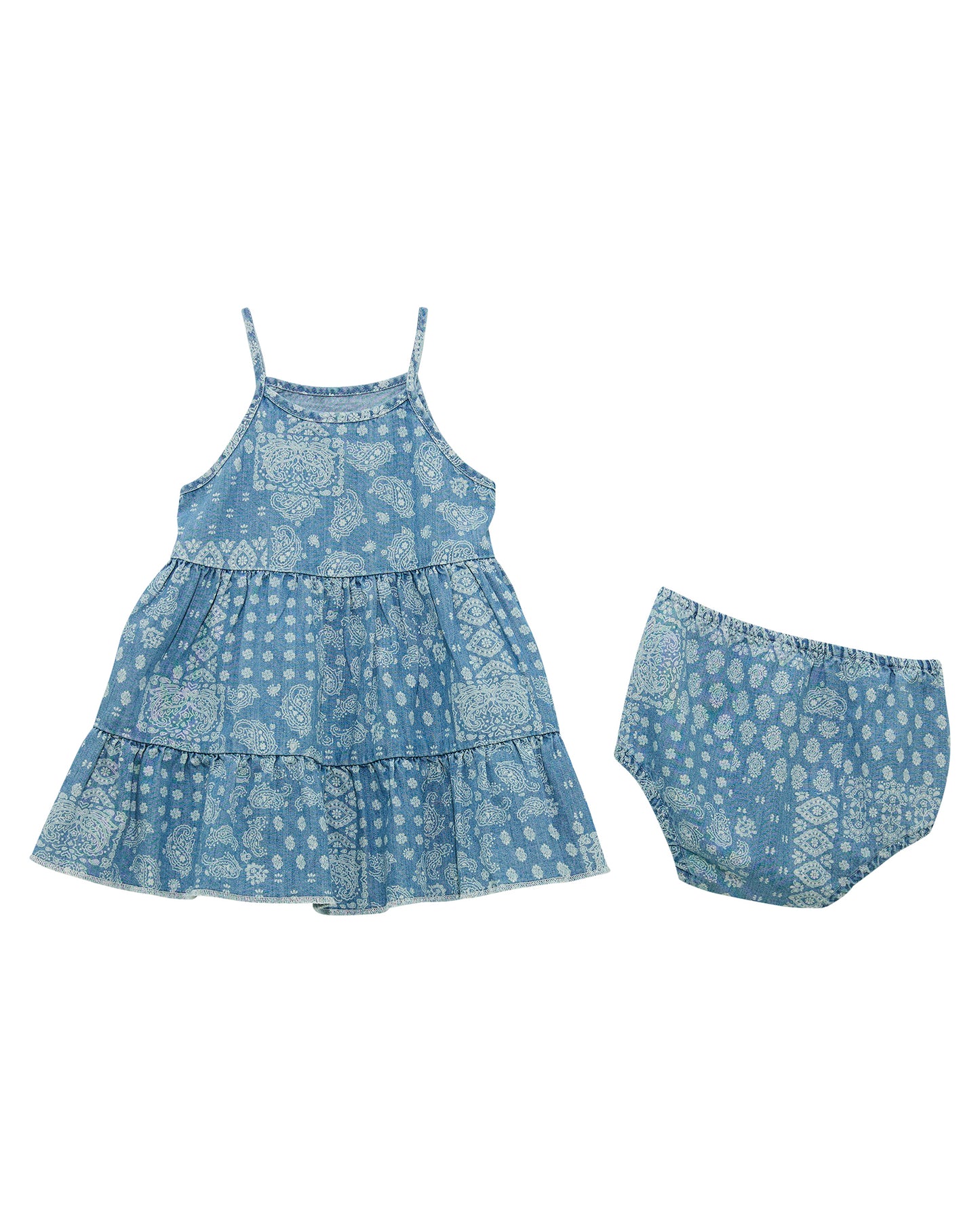 Cowgirl cool. The Little Girl's Wrangler® Bandana Tank Tiered Dress is your new go-to when she wants all her favorite patterns in one place. This soft dress is crafted from 100% cotton and features a lasered bandana print on a lightly ruffled tiered dress with matching diaper cover for sizes 0 – 24 months. It’s a warm-weather staple that's as ready for a rowdy rodeo as it is a sunny summer barbecue.