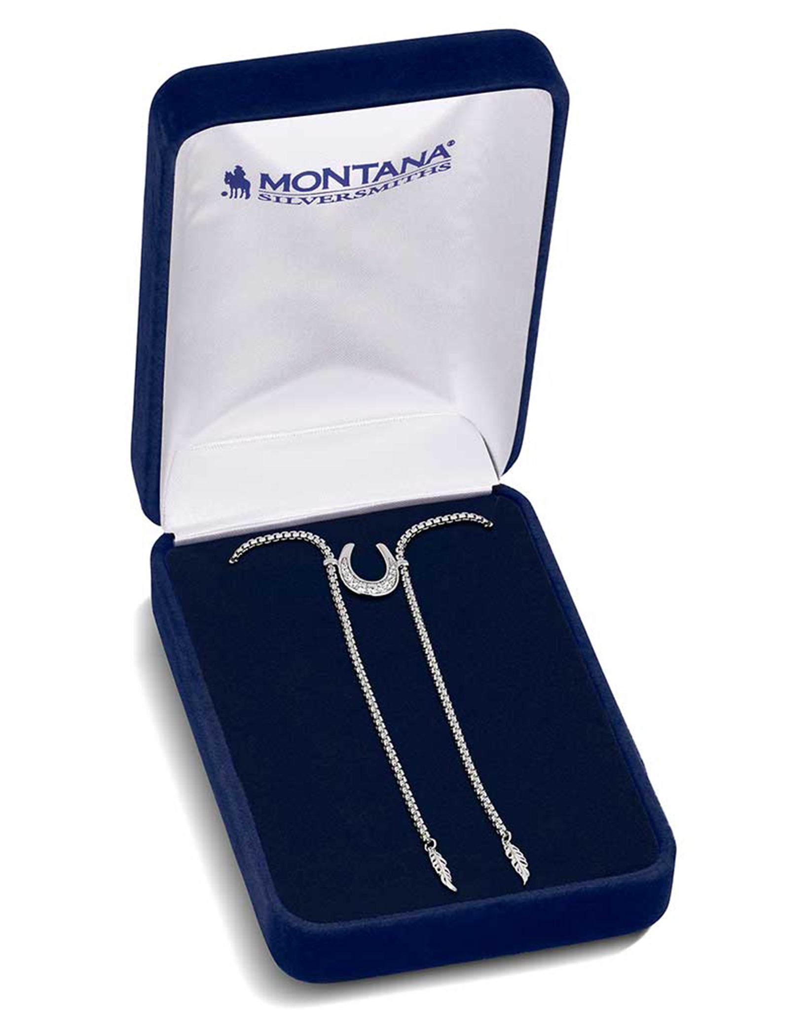 Carry luck with you with the Between Luck Necklace. The necklace has a bolo tie-like design with the chain continuing past the pendant with silver tone feather charms at the end. The center pendant is a silver tone horseshoe with sparkling clear cubic zirconia crystals at the bottom.
