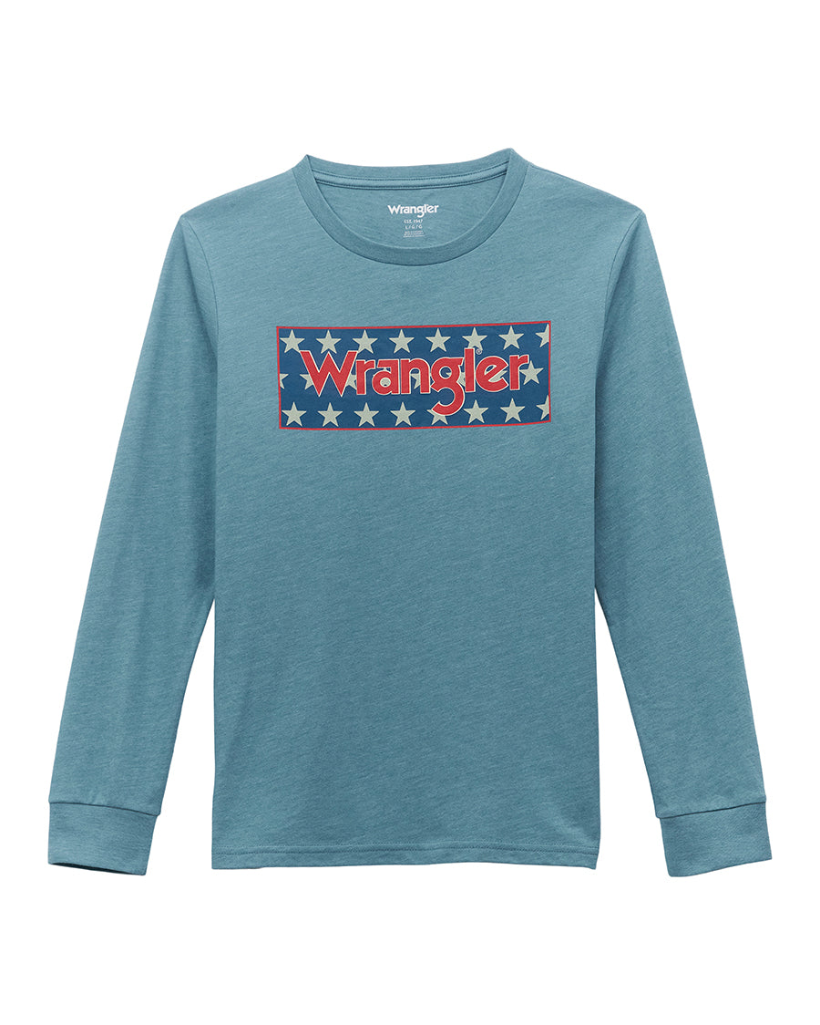When it's too cool outside for short sleeves, our boy's long-sleeve stars logo t-shirt will keep him comfortable. It's crafted from a comfortable cotton blend for lasting quality and softness. On the chest, it features a screen-printed design of the Wrangler® logo in a patriotic color scheme of red, white, and blue.