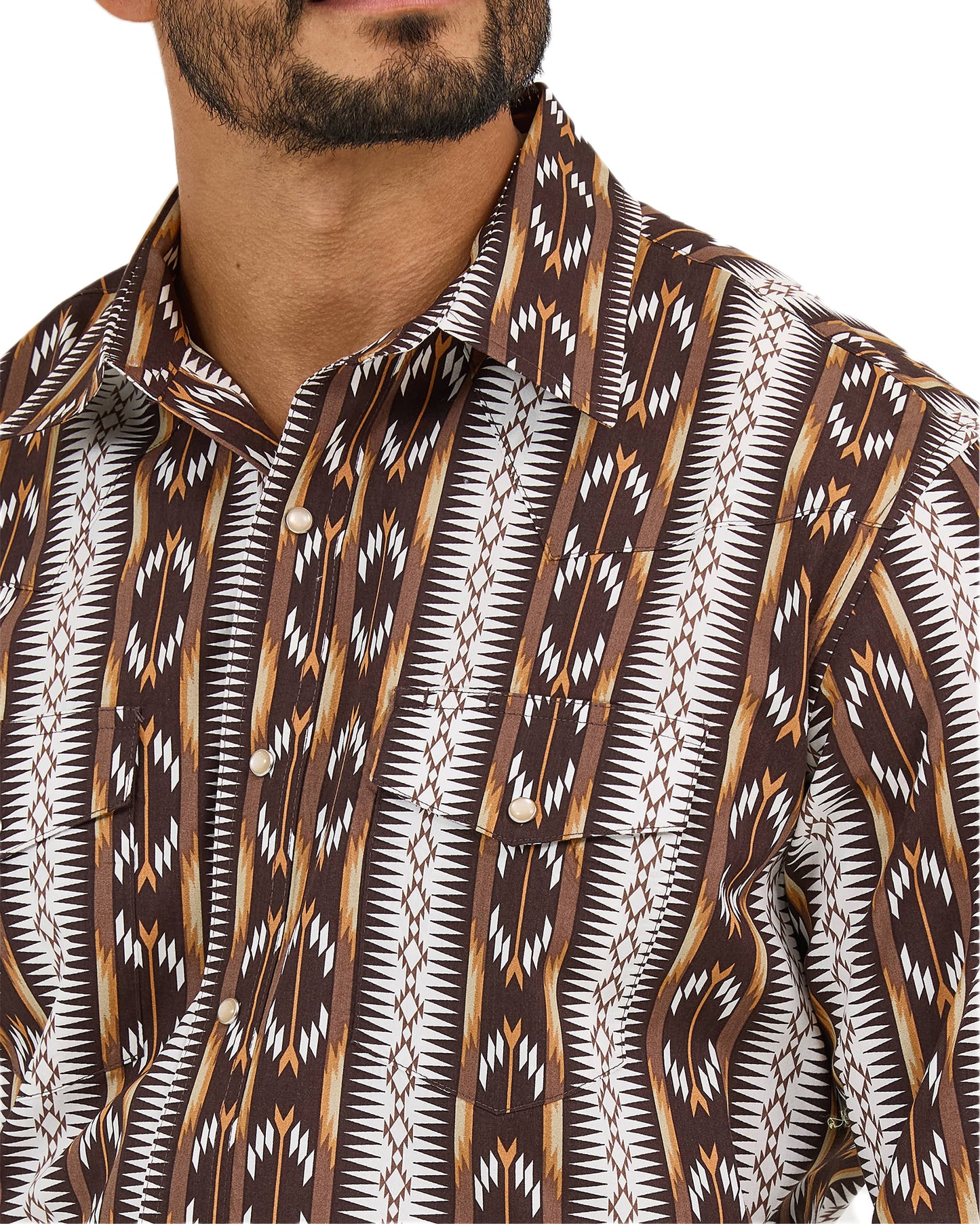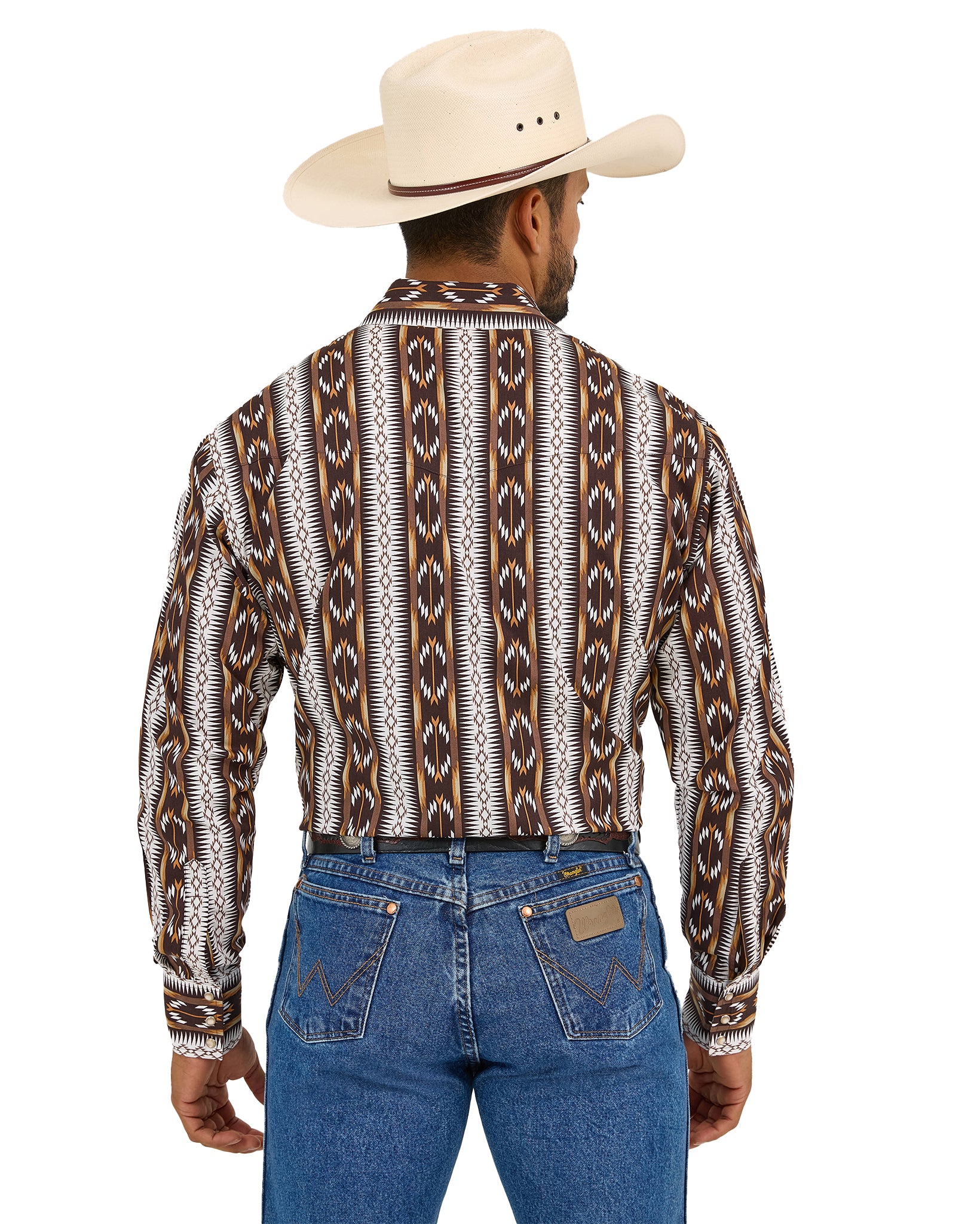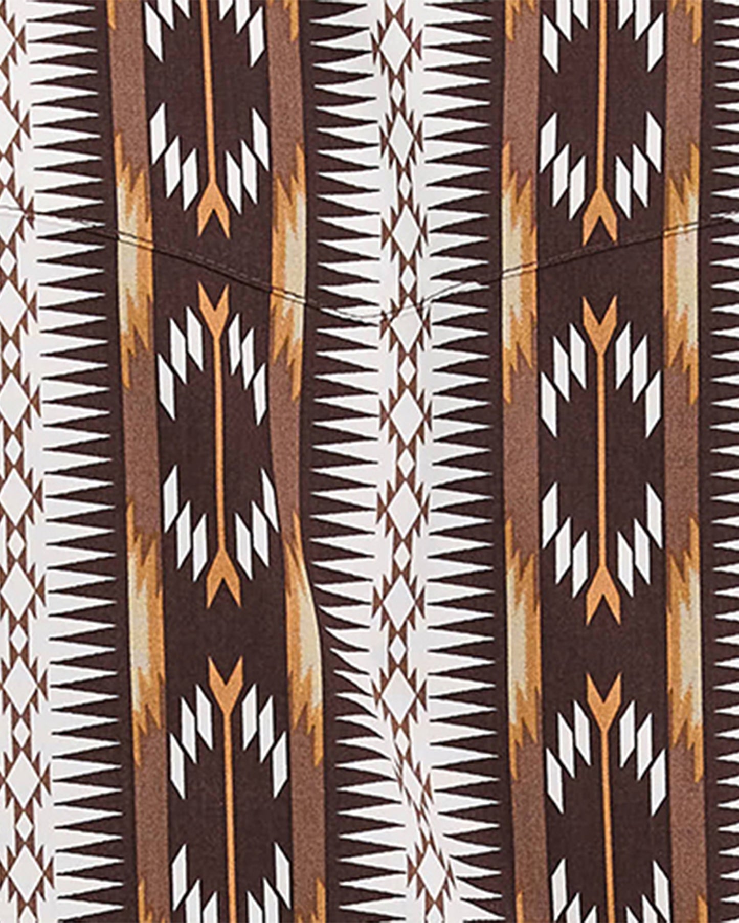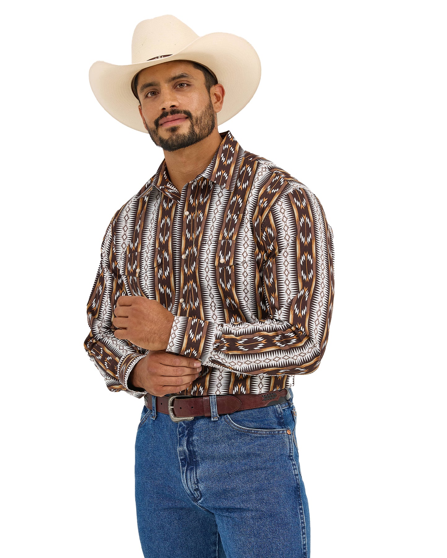 Comes in a classic fit with long sleeves and a spread collar for a timeless look. Other features include authentic western yokes and flap pockets with snap closure, as well as a pencil slot on the left pocket and three snap cuffs. Made with 100% cotton in a stylish brown color.