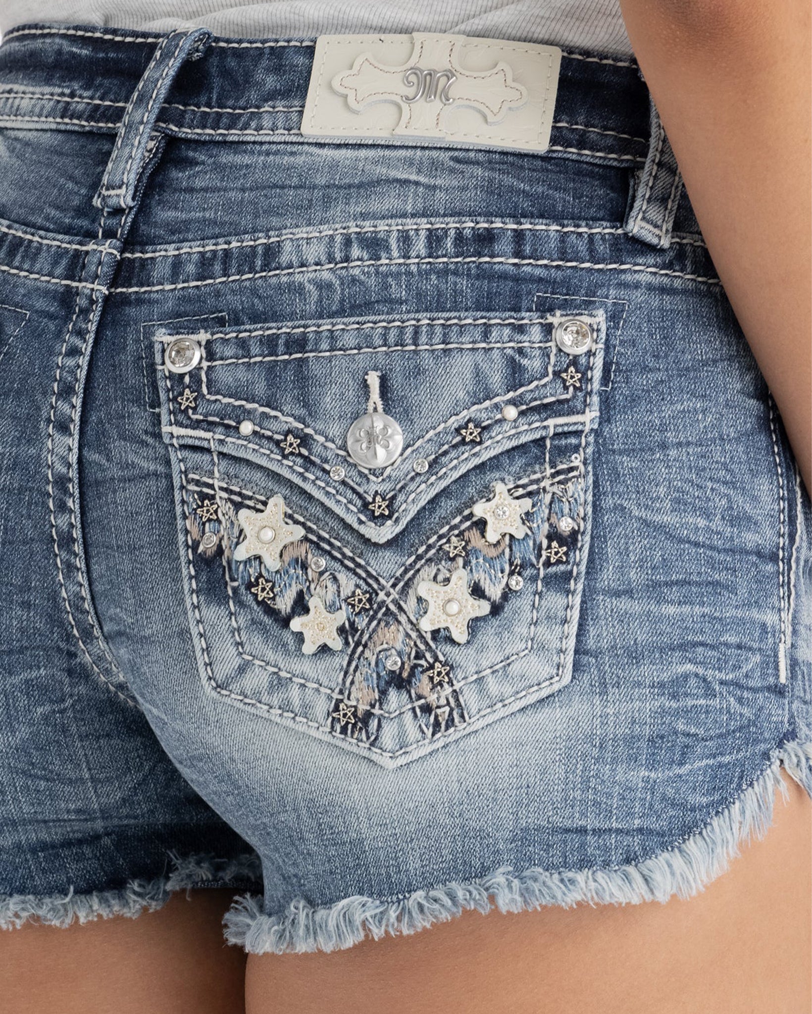 Washed, mid-rise denim shorts featuring an intricate embroidered cross-stitch design with patterned underlay for distinctive texture. These premium Miss Me shorts showcase meticulous craftsmanship with threaded and leather appliqué star embellishments that create a celestial aesthetic. Luxury details include faux pearl accents, sparkling sequins, and rhinestone rivet embellishments that catch the light with every movement. The embossed white leather cross and signature Miss Me brand patch authenticate these artisanal shorts. Practical features include strategic whiskering for a lived-in appearance, deliberately frayed hems for casual sophistication, and the classic 5-pocket design for functionality. Constructed from 99% Cotton with 1% Elastane for superior comfort and subtle stretch that maintains shape throughout wear. The Stars Align shorts deliver both statement style and everyday wearability for the discerning western fashion enthusiast.