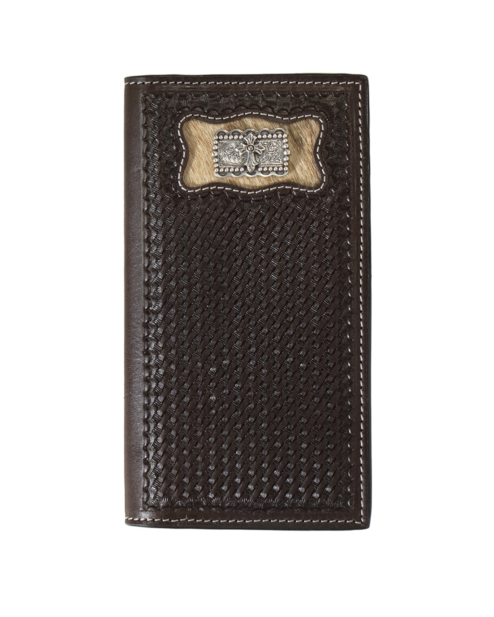 This authentic rodeo wallet showcases masterful hand-tooled craftsmanship with a striking sunburst and basket weave pattern complemented by calf hair inlay details. Constructed from genuine leather, it combines traditional Western aesthetics with practical functionality. The interior features multiple card slots and a dedicated ID window, making it an ideal choice for those who appreciate both heritage design and everyday utility.