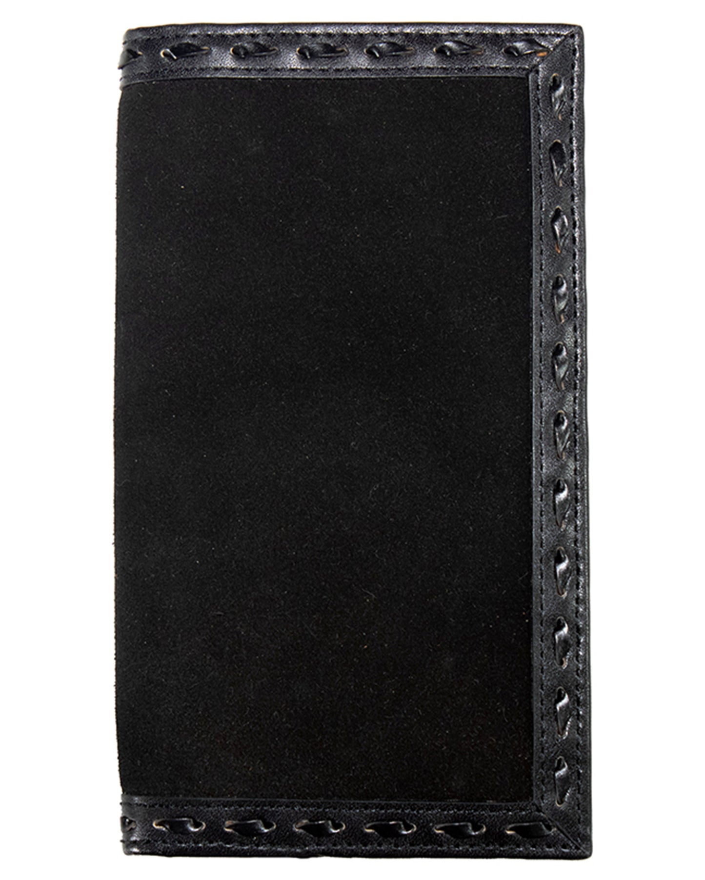 This authentic leather M&F Western Products 3D rodeo wallet features a black roughout body, black leather edge, and black buck lace. The interior includes multiple card and cash slots, a checkbook slot, and an ID window for added convenience.