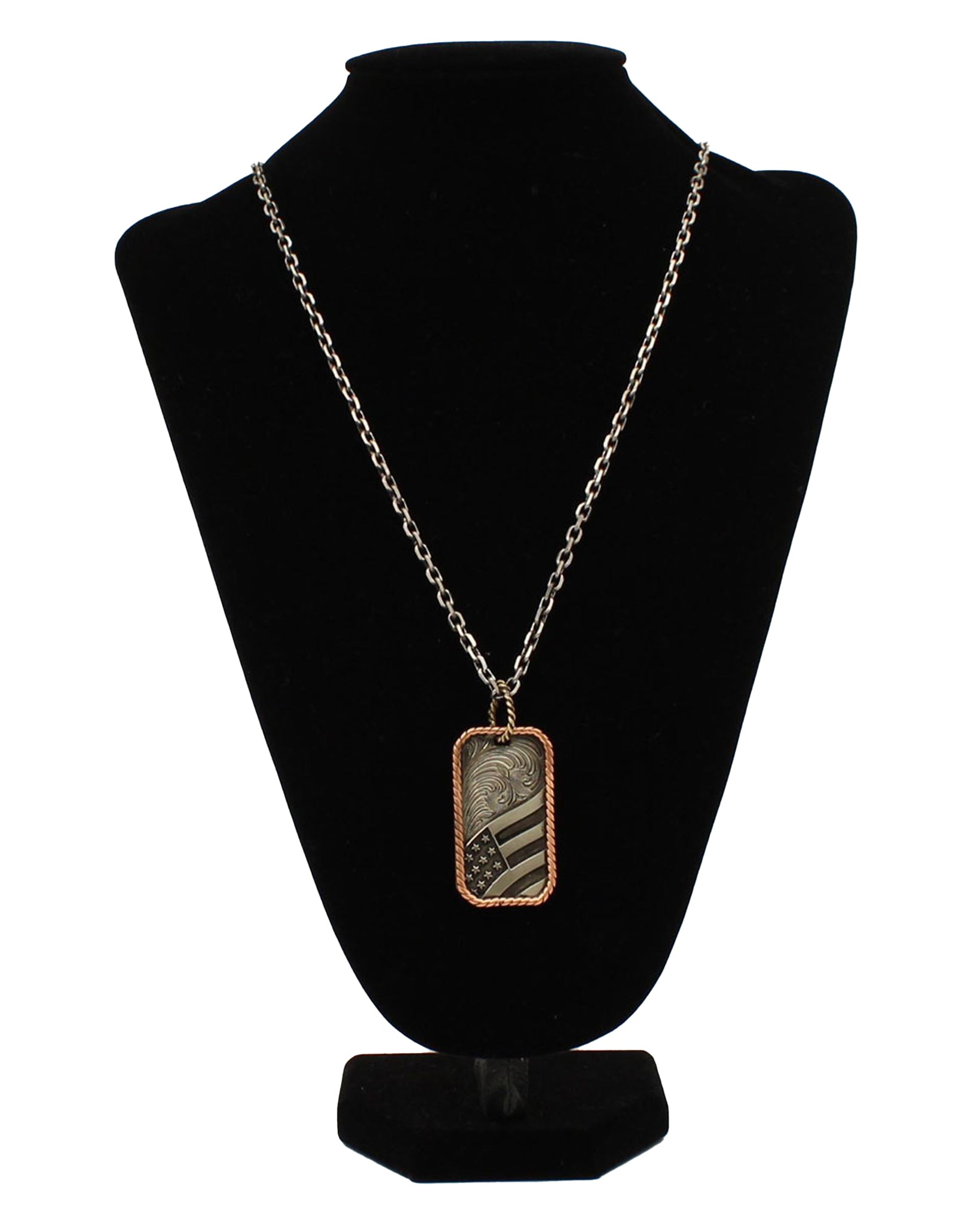 This striking pendant combines classic Western aesthetics with patriotic symbolism. Crafted in antique silver, the dog tag-style design features an intricate USA flag motif accented by elegant floral scrollwork. The rope edge detailing in antique copper adds authentic character and dimension, making it a versatile piece for collectors and enthusiasts alike.