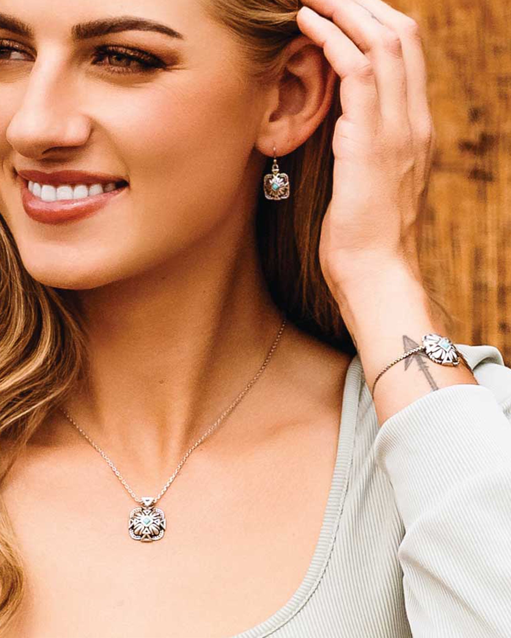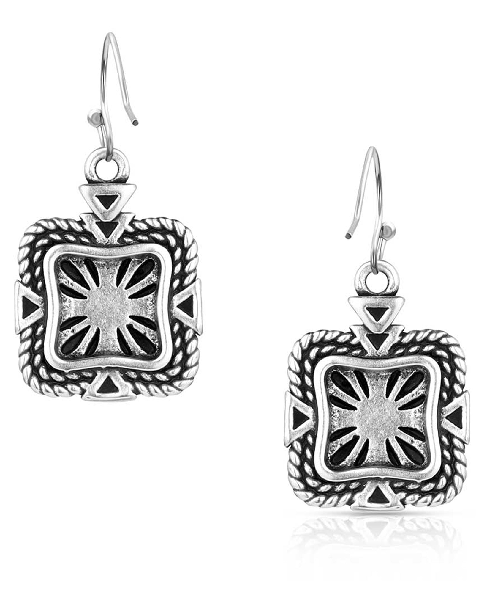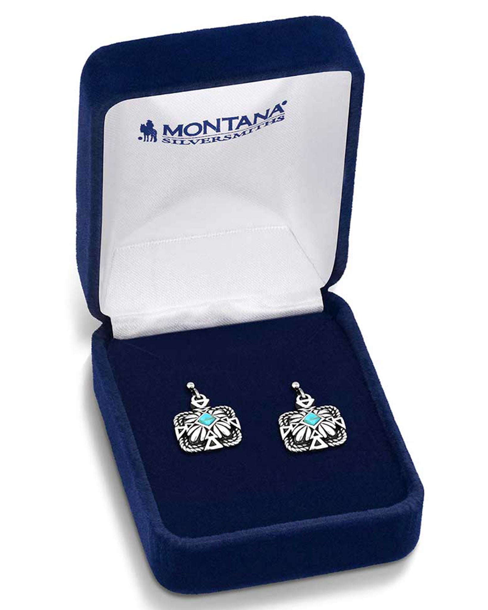Add a subtle statement accessory to your collection with the Desert Sage Turquoise Earrings. The earrings are a silver tone, square shape, with a twisted rope border. An etched design covers the background, and dark black paint brings out the details in the design. In the center is a square-shaped turquoise stone that adds a hint of color to the earrings.