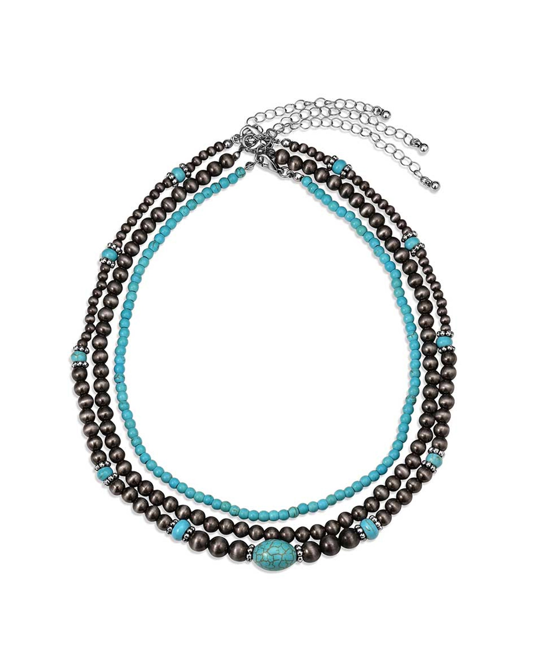 The Desert Song Necklace is a 20 inch layered necklace with a mix of matte silver beads and turquoise stones. A ready made stack that captures western spirit in every strand. Stone color may vary.