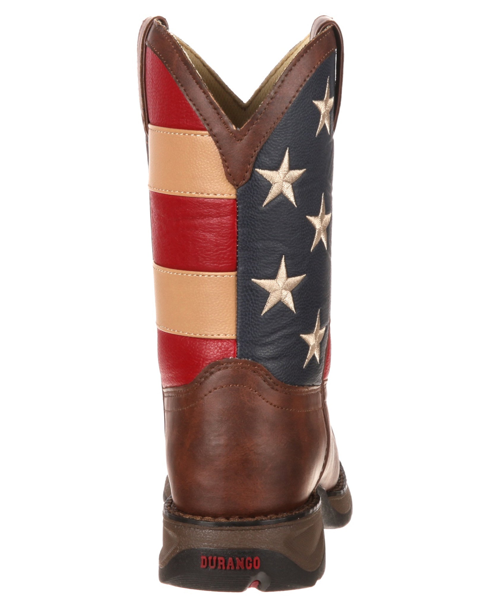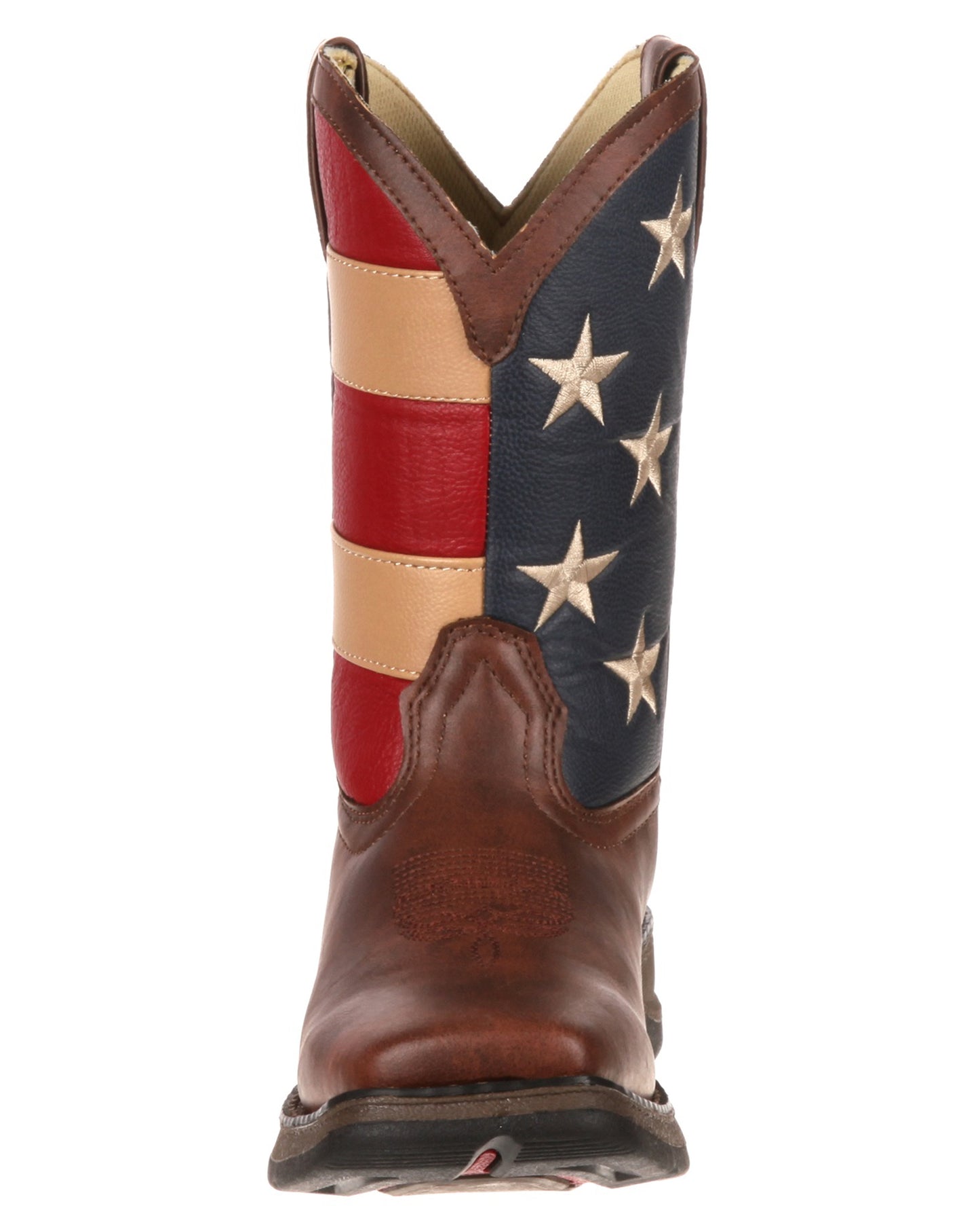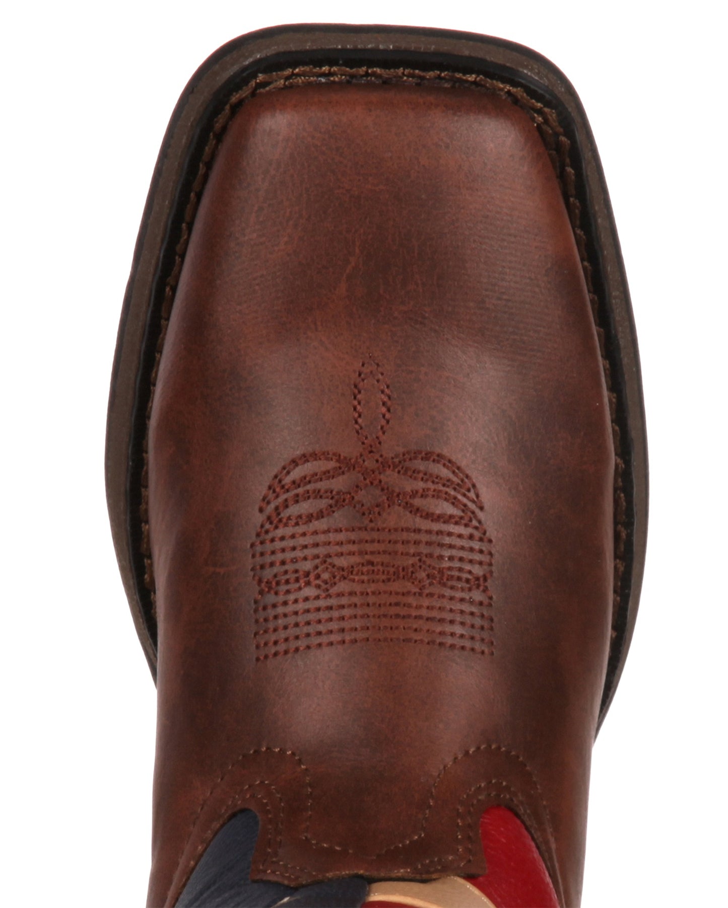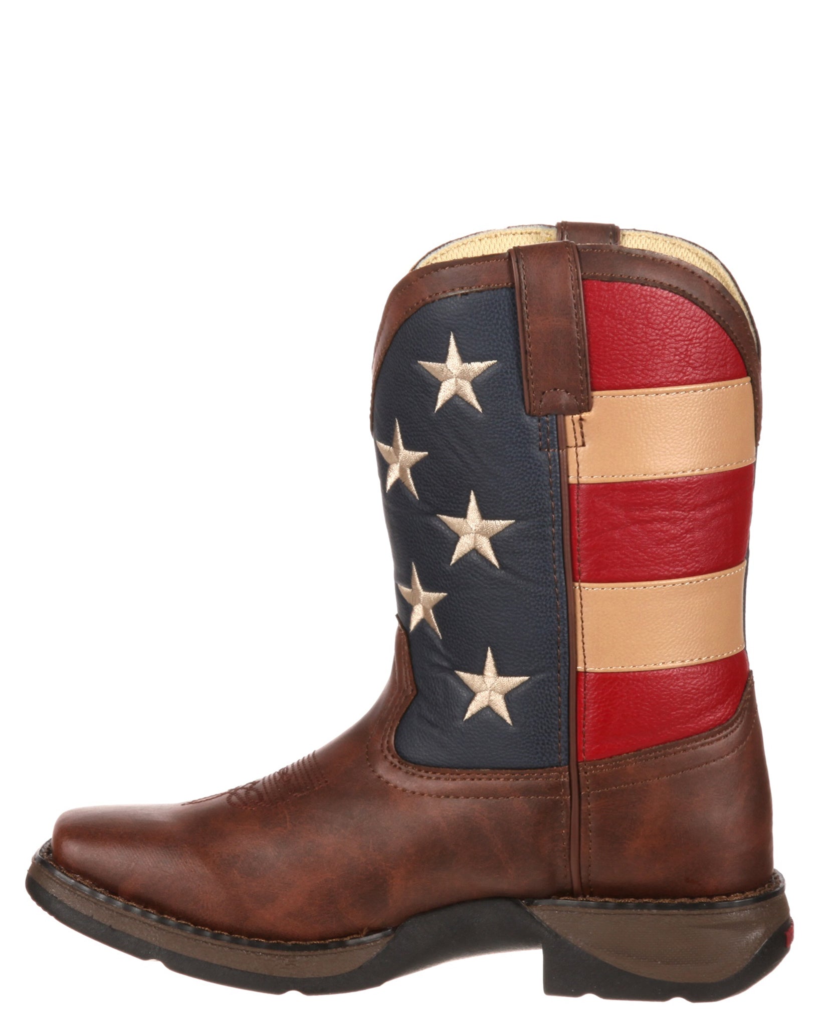 The Lil' Durango kids' boot features an 8" shaft crafted from brown synthetic leather paired with a vibrant flag design. Choosing man-made materials for children's footwear is a smart choice—it offers the authentic look and feel of genuine leather while providing durability for everyday wear. These boots are resistant to damage and simple to clean, making them ideal for active kids.
