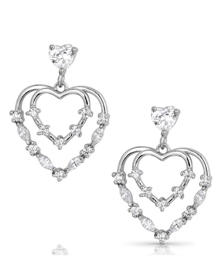 Let your love grow with these beautiful and sparkling earrings. A hypoallergenic post back wire that attaches to a clear cubic zirconia crystal in a dainty heart shape. Dangling below are two silver tone open heart shapes with one being smaller in the center. At the bottom of both hearts there are clear cubic zirconia crystals set apart from each other for subtle sparkle.