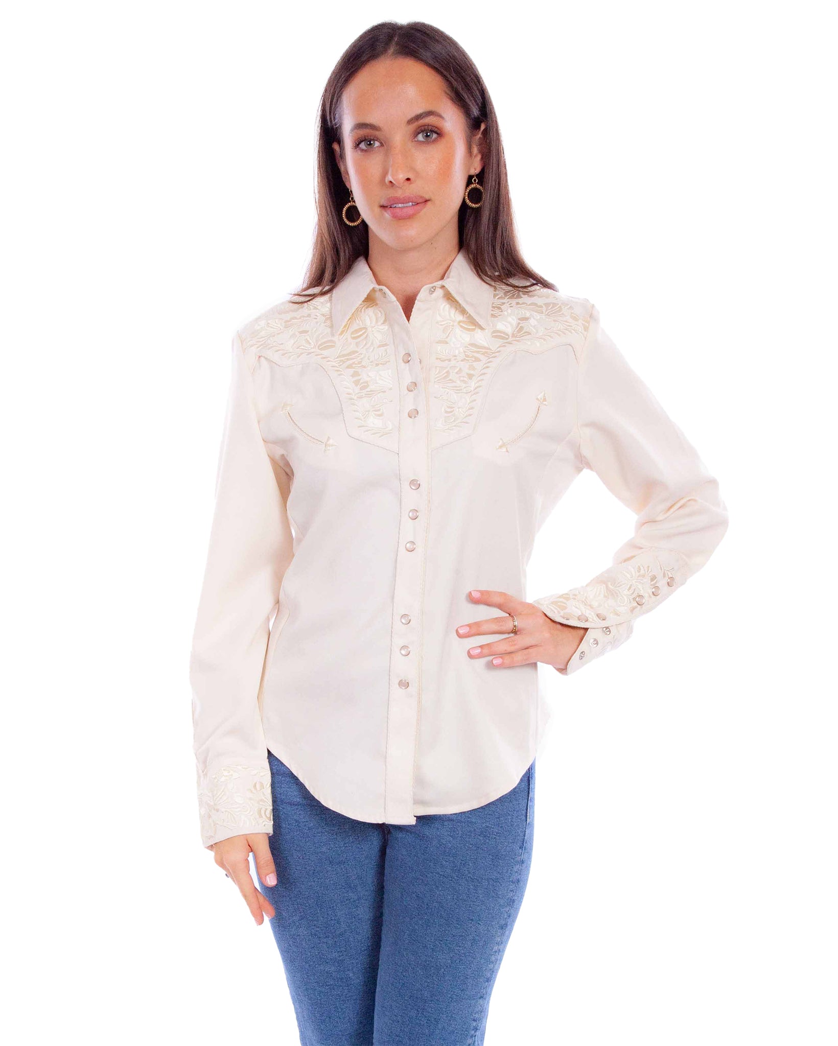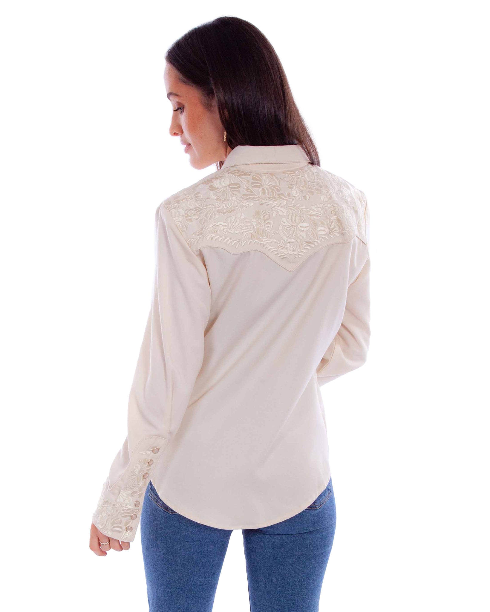 - Floral embroidery on yoke (front/back) and sleeve.