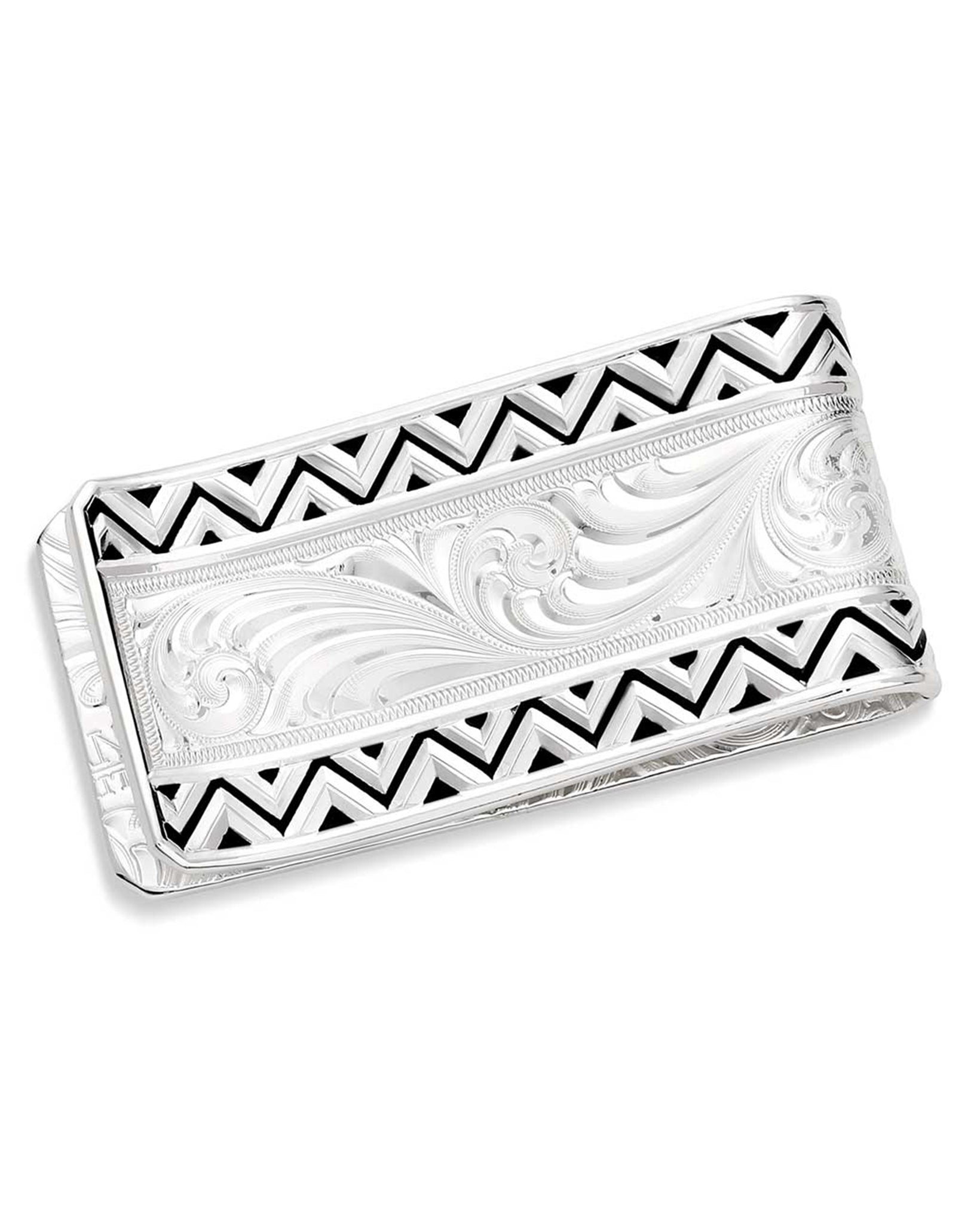 Keep your cash secure in style with the Four Winds Money Clip. This money clip features a silver geometric pattern at the top and bottom with black paint to add contrast. Silver engravings can be seen in between the geometric pattern.