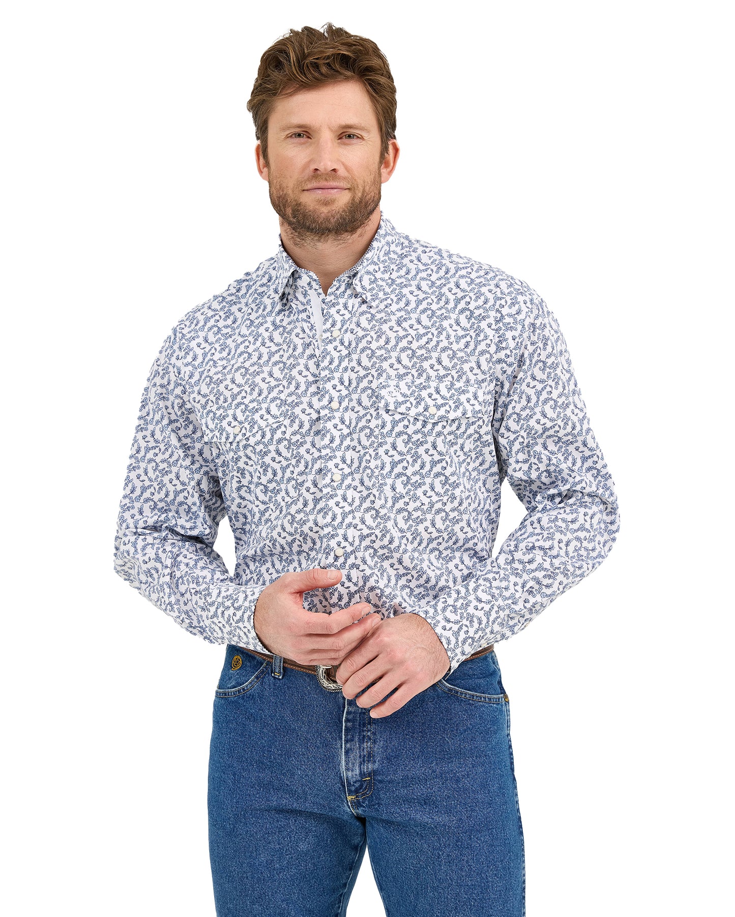 Tradition at it's finest. Every cowboy needs a shirt for dressy occasions. Luckily, the George Strait™ Troubadour Shirt fits the bill with its authentic details, including a button-down collar, pointed yokes, two chest flap pockets, a full snap closure, and three-snap barrel cuffs. This long-sleeve Western shirt is made of a woven cotton blend with a relaxed fit for all-day comfort.