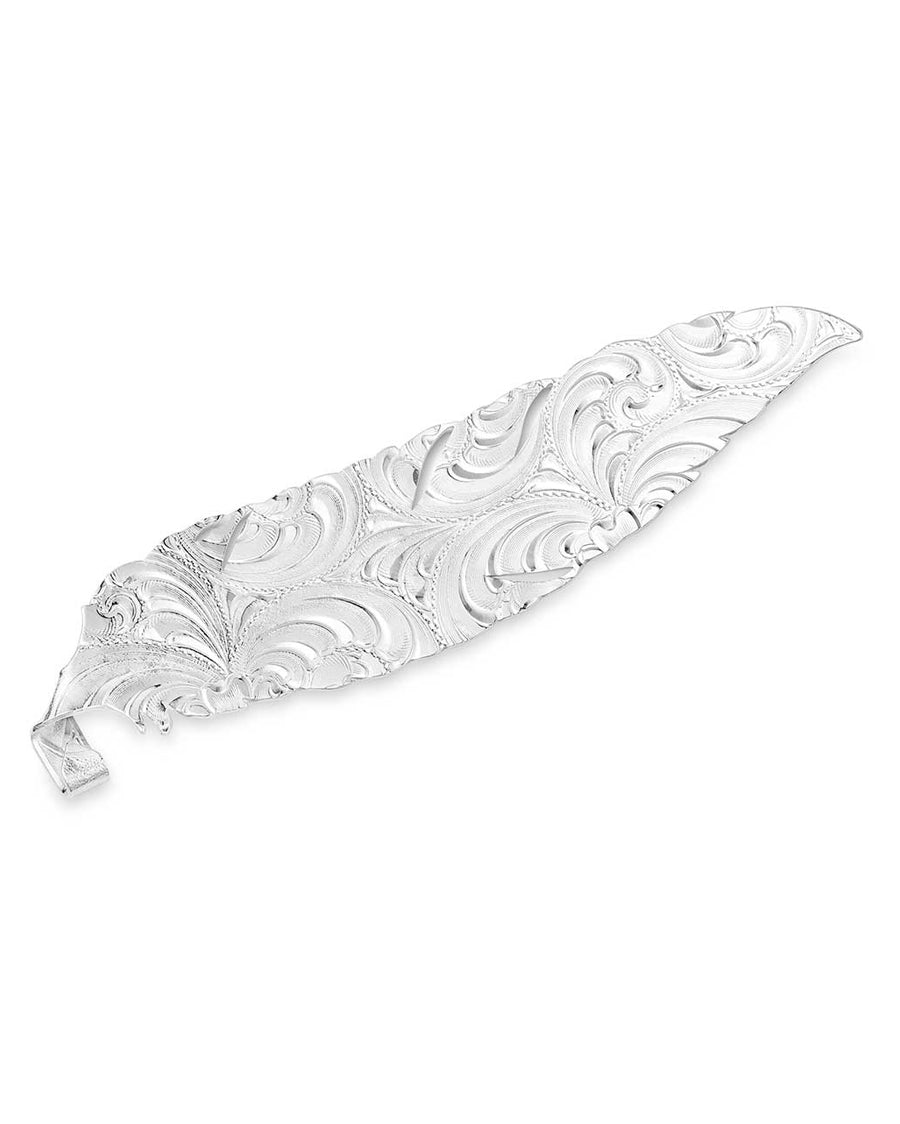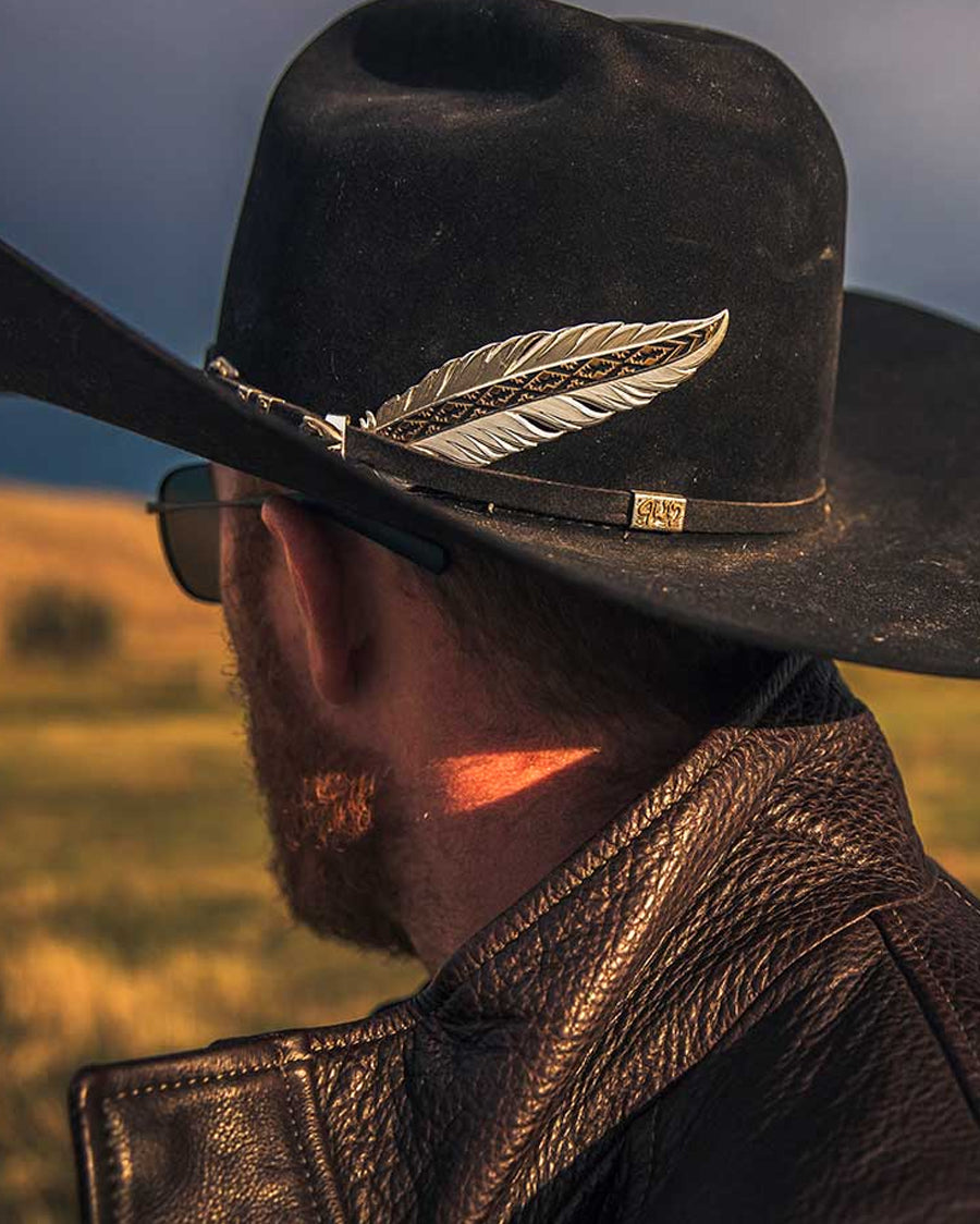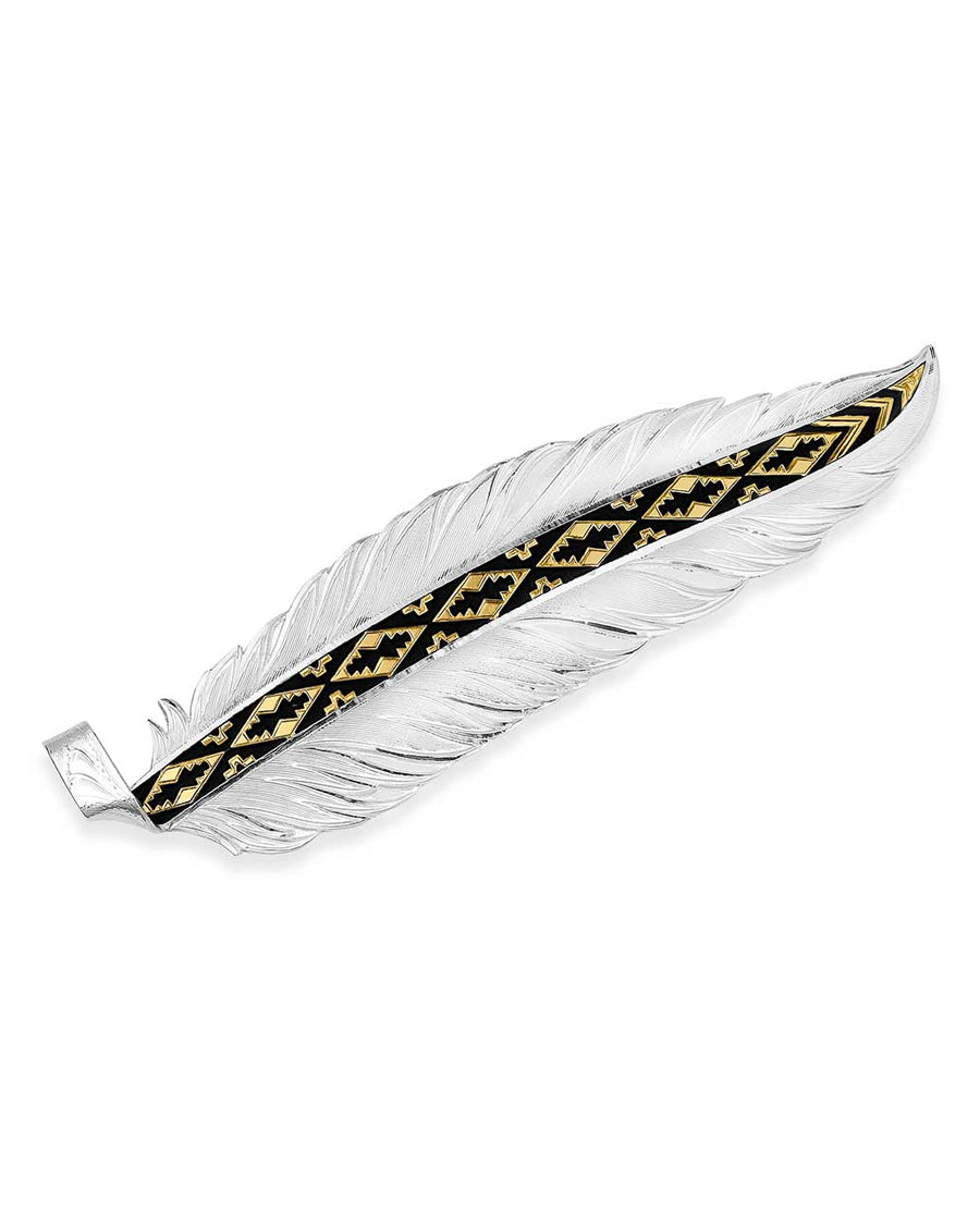 Add a bold accessory to your hat with the Trust and Honor Hat Feather. This two tone hat feather features a bright silver finish that creates the feather design. Through the center vein is a gold tone with a bold Southwest design that is made to stand out with deep black paint.