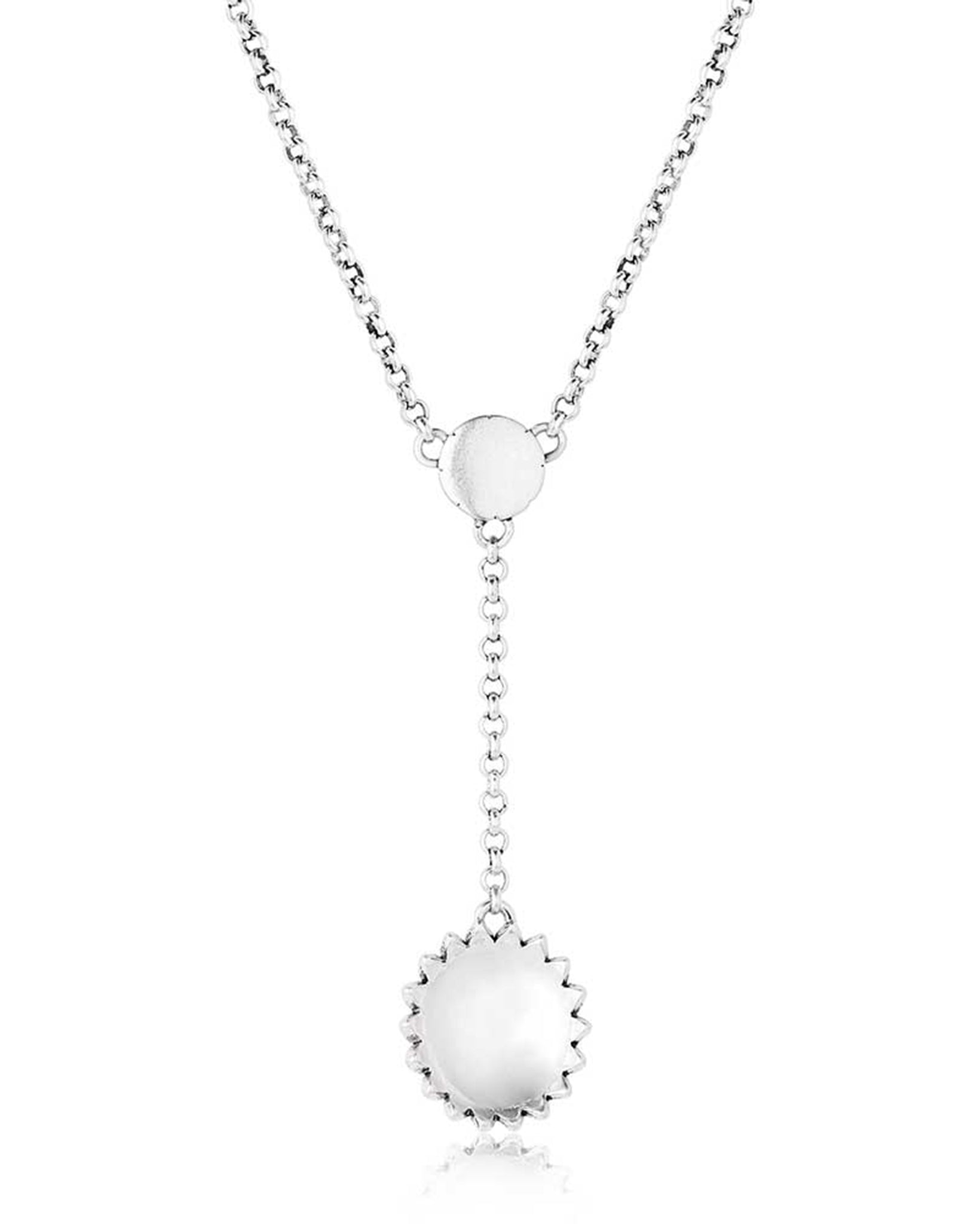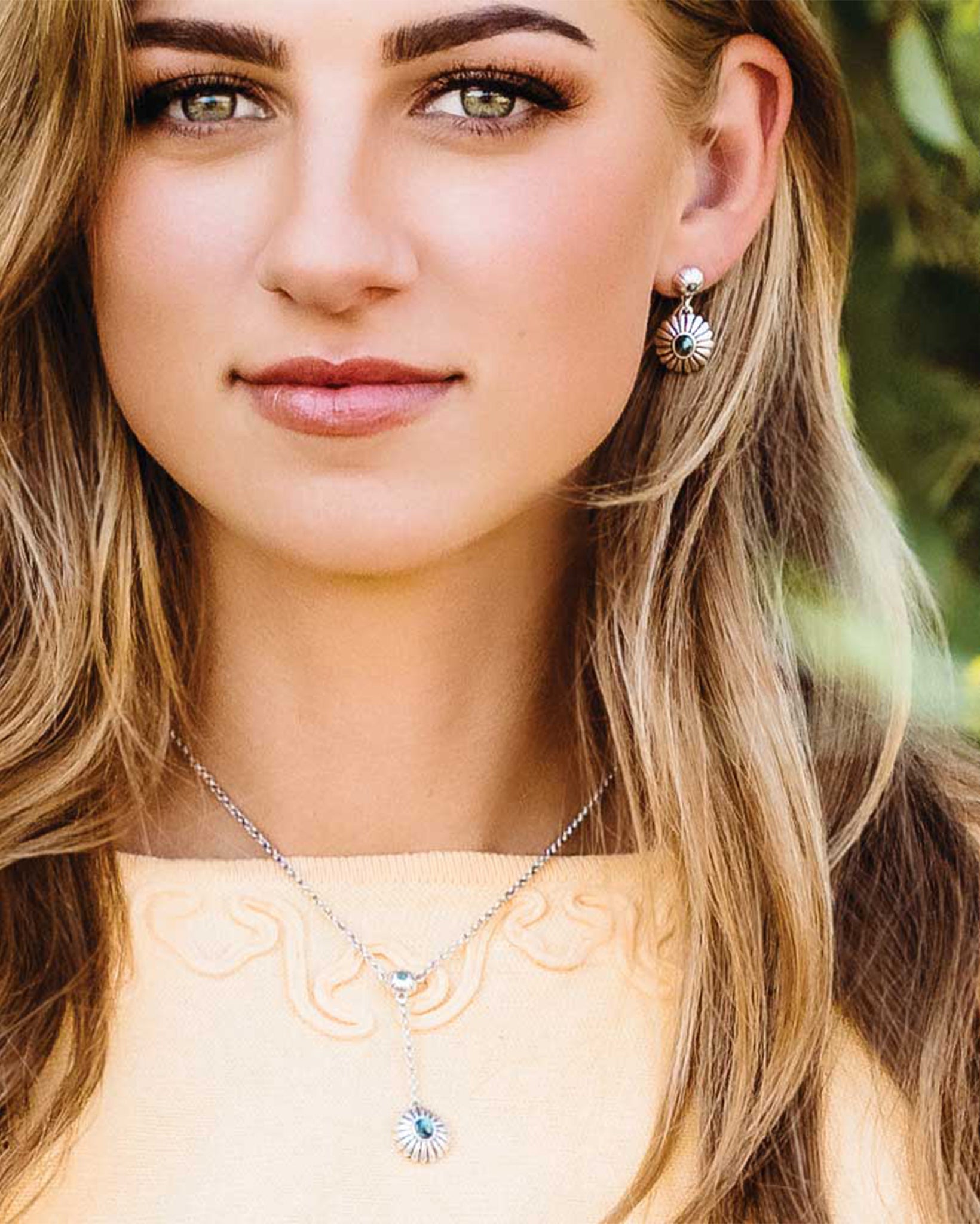 Every day can feel like a fresh spring day with this Heyday Blossom Necklace. A small silver tone blossom ties the chain together and has a crafted turquoise stone in the center. Hanging below is a larger blossom with a crafted stone. Both blossoms have black paint to outline each of the petals.