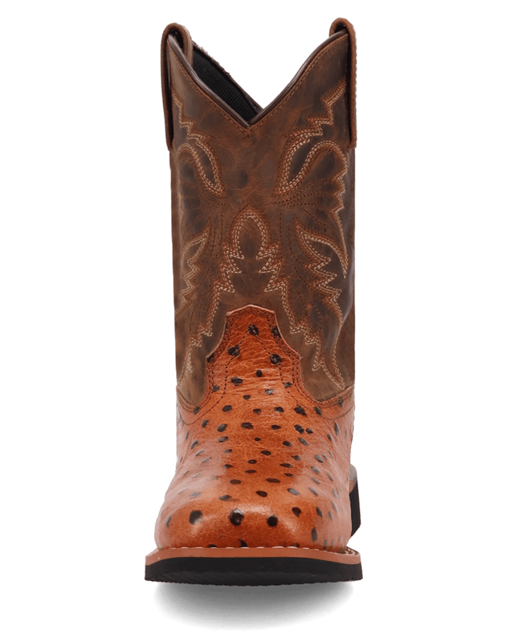 The Jet Kids Boot is built for the next generation of cowboys. With a bold broad square toe, stockman heel, and cushioned comfort insole, it’s made for all-day adventure. The durable rubber outsole ensures steady footing, while the ostrich print foot design brings a touch of flair to this rugged, hardworking boot.