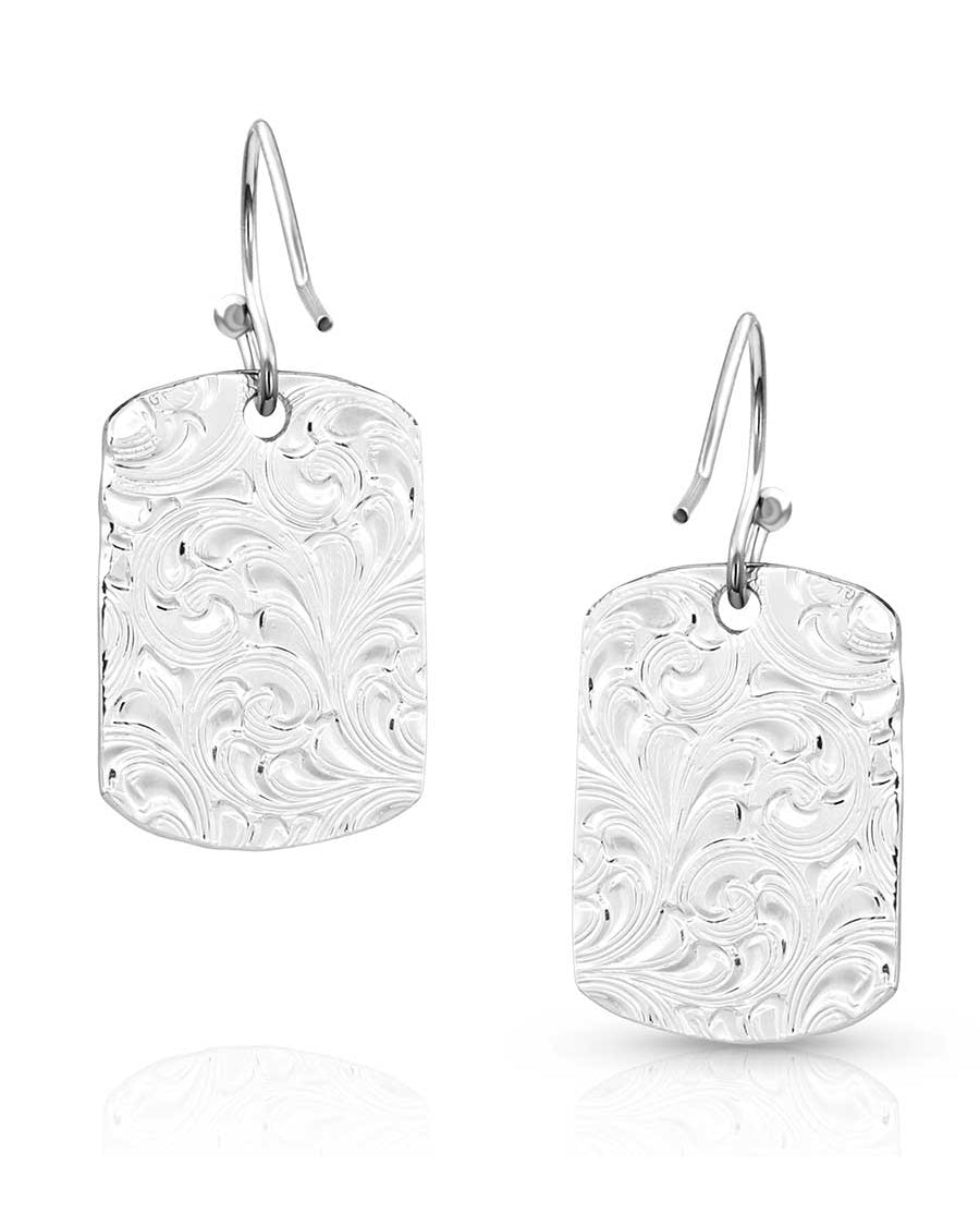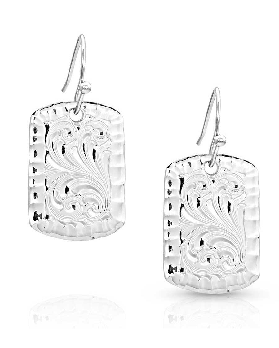 These incredible earrings are inspired by Miss Rodeo America 2023 Kennadee Riggs platform this year of Kicking up Kindness. The bright silver finished tag earrings will catch the light with every step. The center of the tag is filled with bright cut western engraving that pairs with the carved edge for a unique and Western look. The earrings are perfect to pair with any silver tone pieces and are secured by a hypoallergenic French wire.