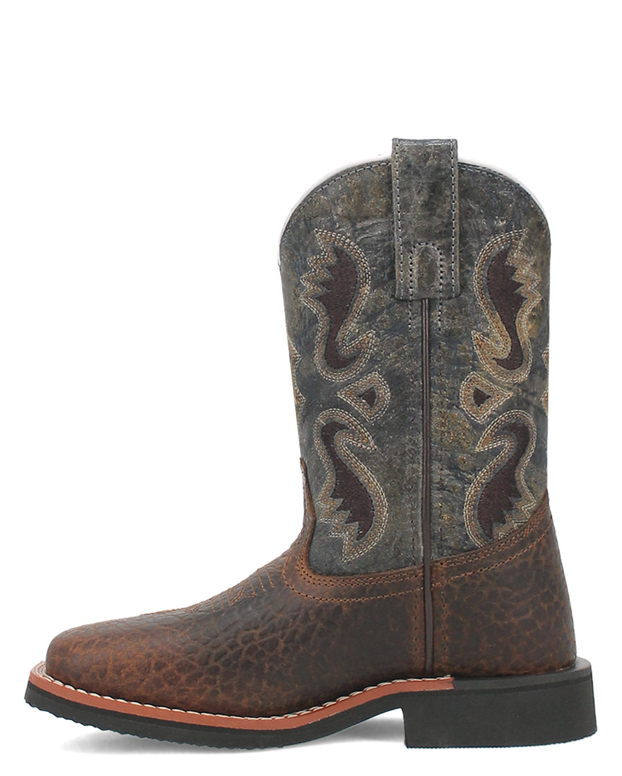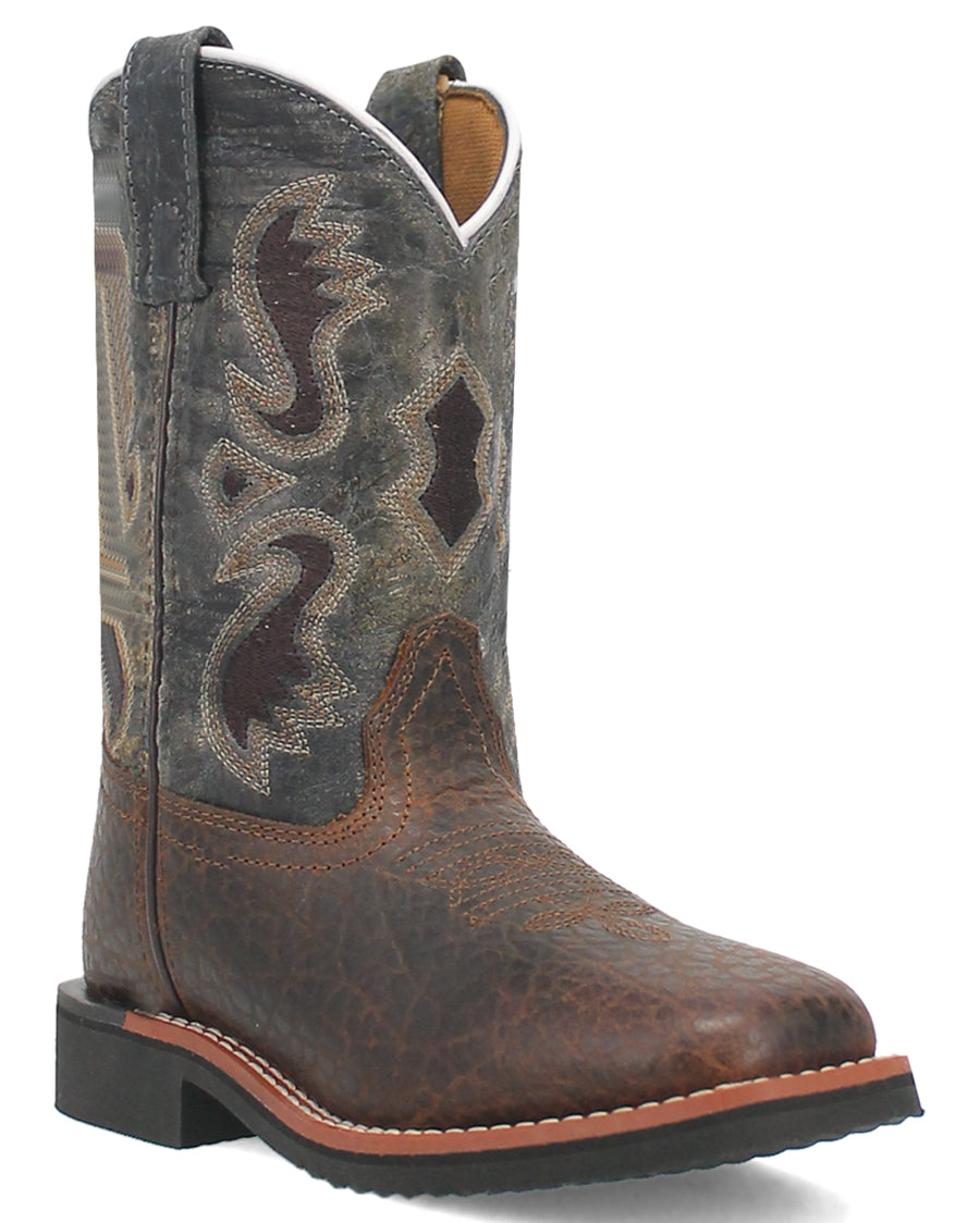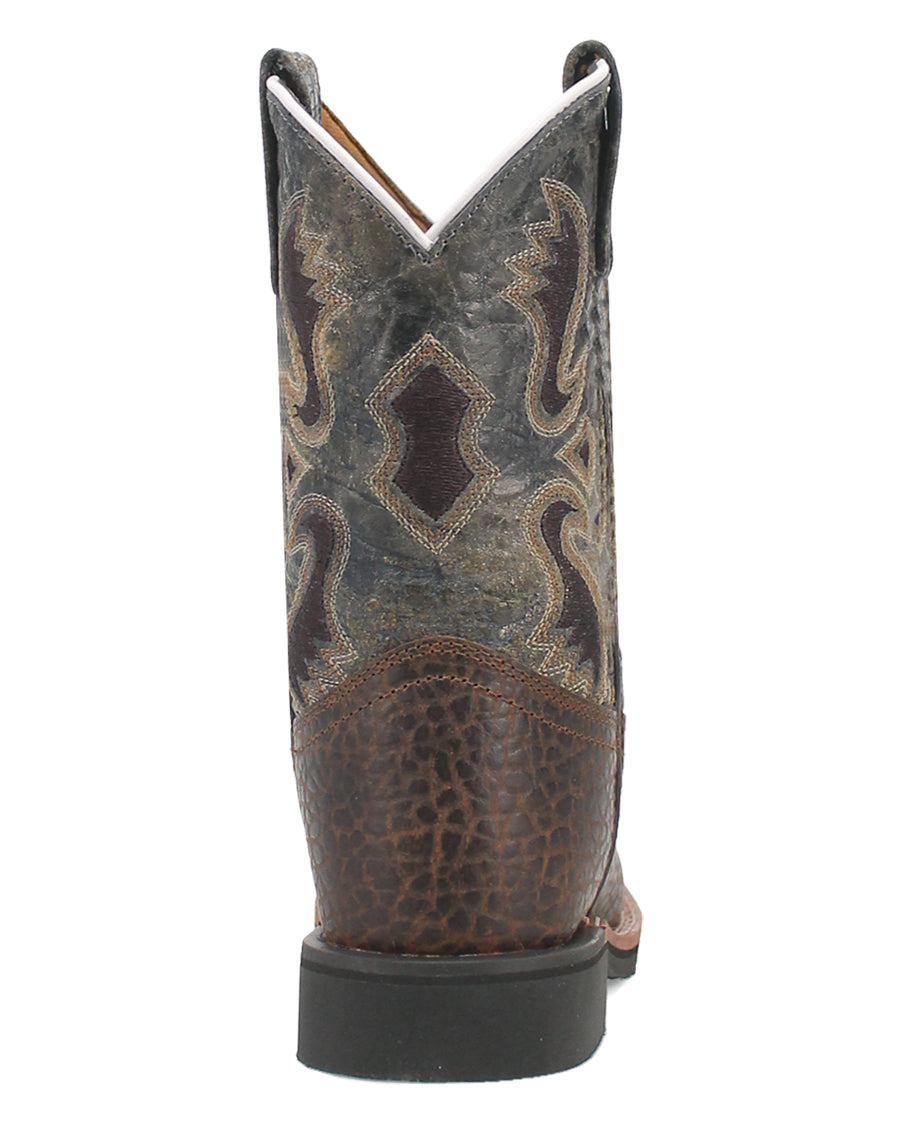 The Creek cowboy boot by Dan Post seamlessly captures the essence of nature's enduring charm. Drawing inspiration from the beauty of creeks and the great outdoors. Crafted from high-quality pebble leather, this boot boasts a deep blue shaft, artfully adorned with subtle hues of brown, evoking the natural richness found along the banks. Removable cushion comfort, broad square toe, digger rubber outsole, and stockman heel will have your little guy ready for nature's best.
