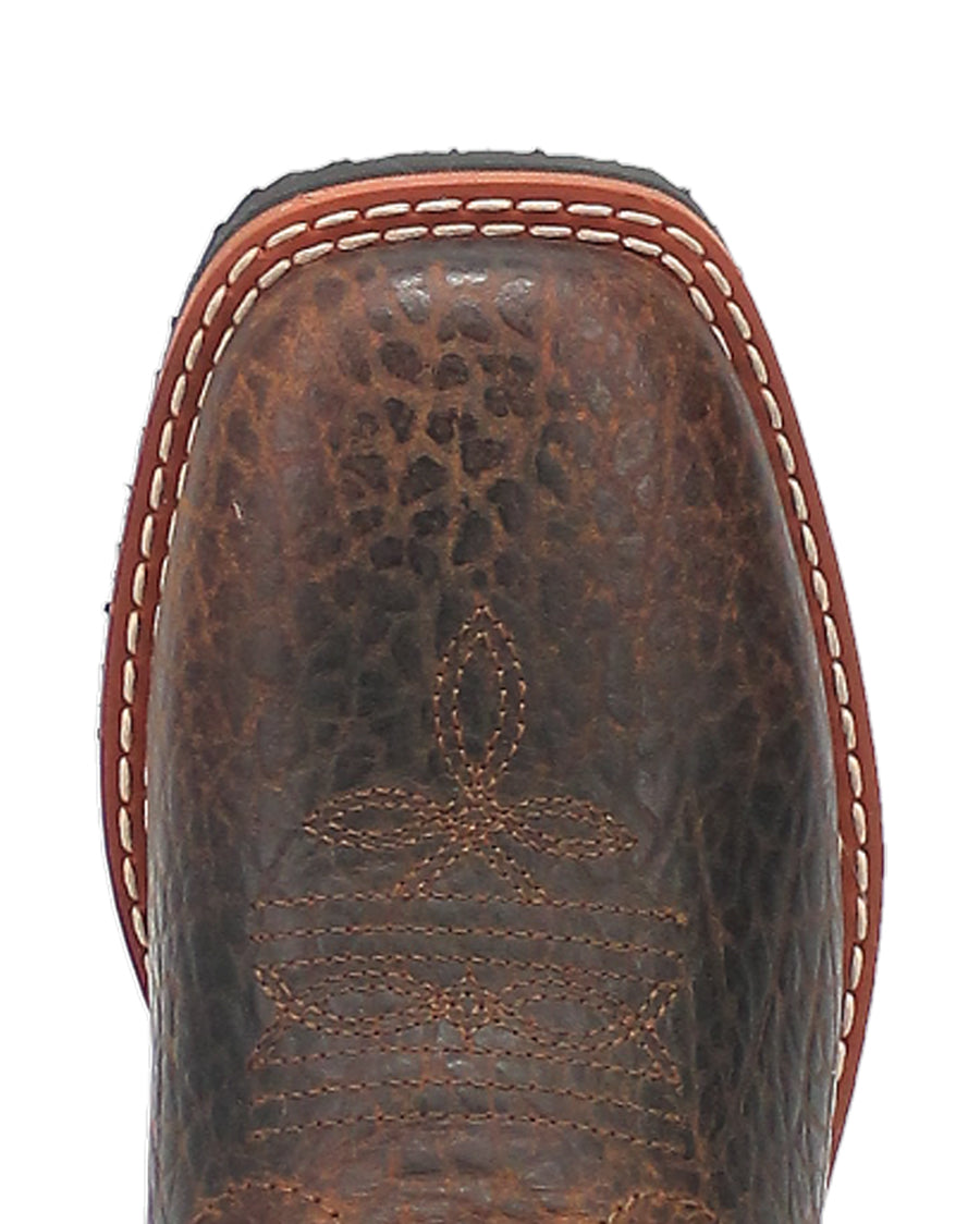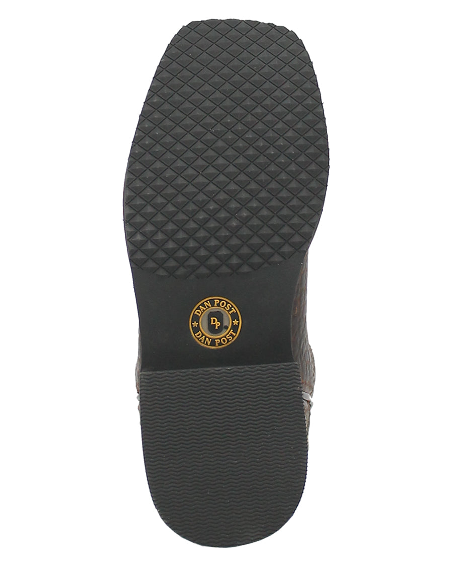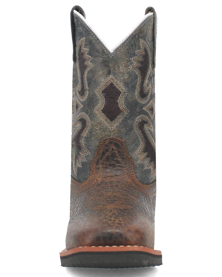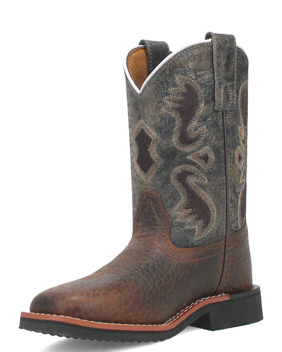 The Creek cowboy boot by Dan Post seamlessly captures the essence of nature's enduring charm. Drawing inspiration from the beauty of creeks and the great outdoors. Crafted from high-quality pebble leather, this boot boasts a deep blue shaft, artfully adorned with subtle hues of brown, evoking the natural richness found along the banks. Removable cushion comfort, broad square toe, digger rubber outsole, and stockman heel will have your little guy ready for nature's best.