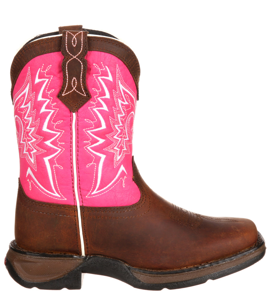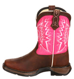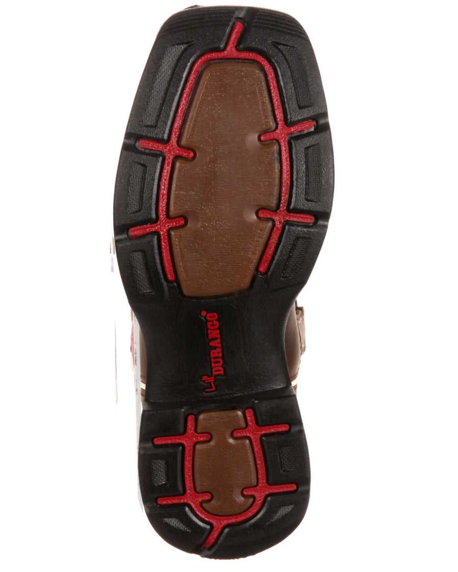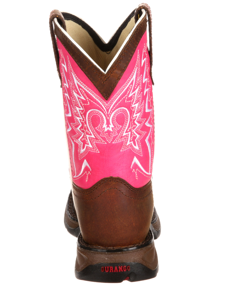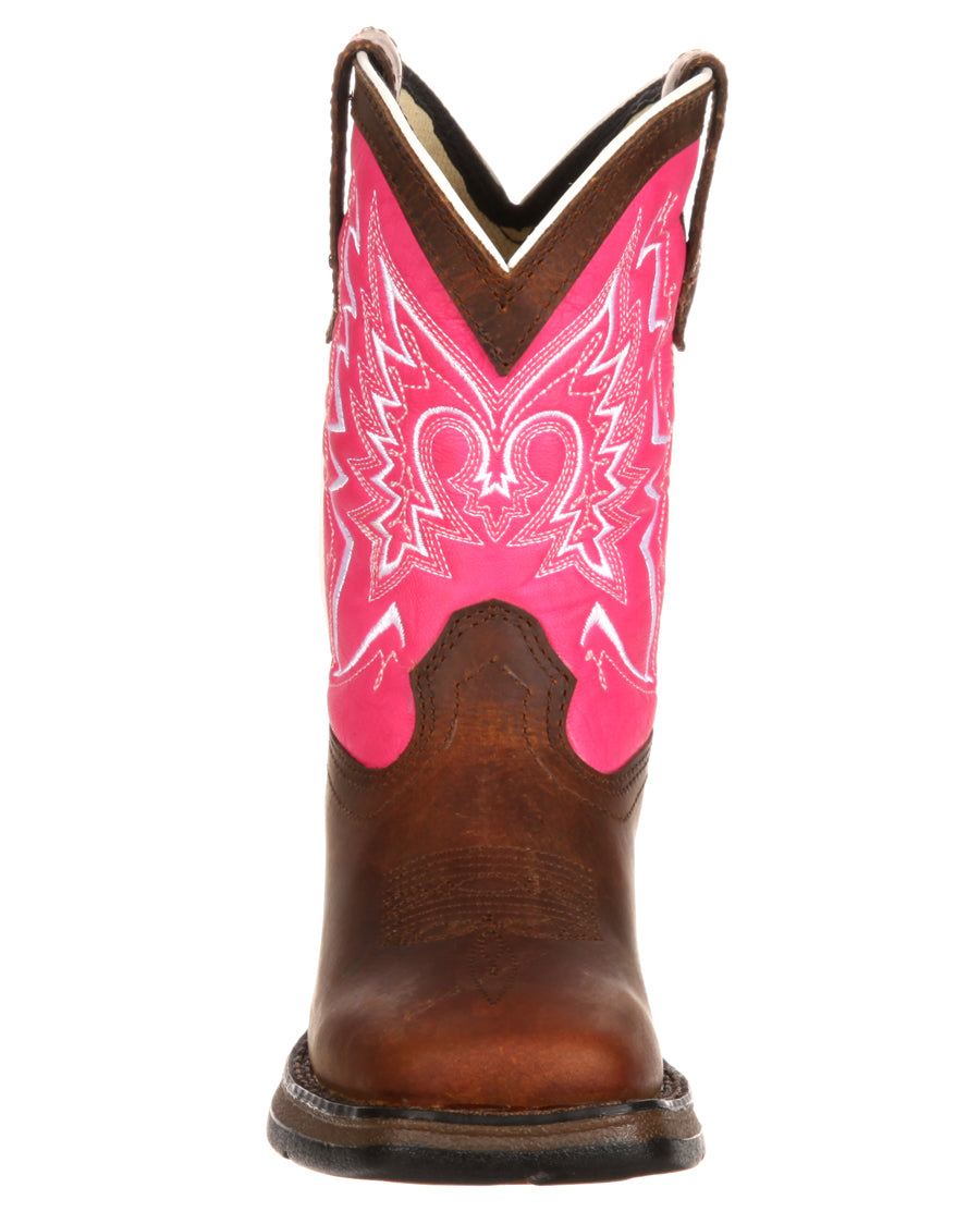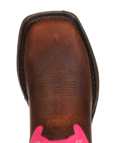 Your little cowgirl will love these beautiful pink and brown boots by Durango. Made with all the quality and durability that you’d get in an adult pair of Durango boots, these have it all. They feature full-grain leather, contrast stitch detail, pull tabs and dip openings. The outsoles are made of rubber with a 1” heel. Inside, they have cushion flex insoles and a tempered steel shank. They’ll support your little one’s feet while looking great.