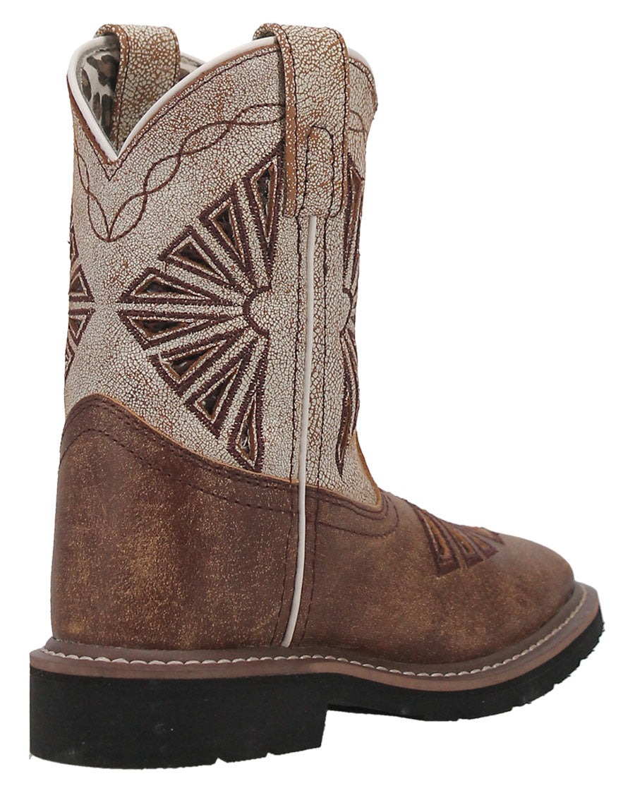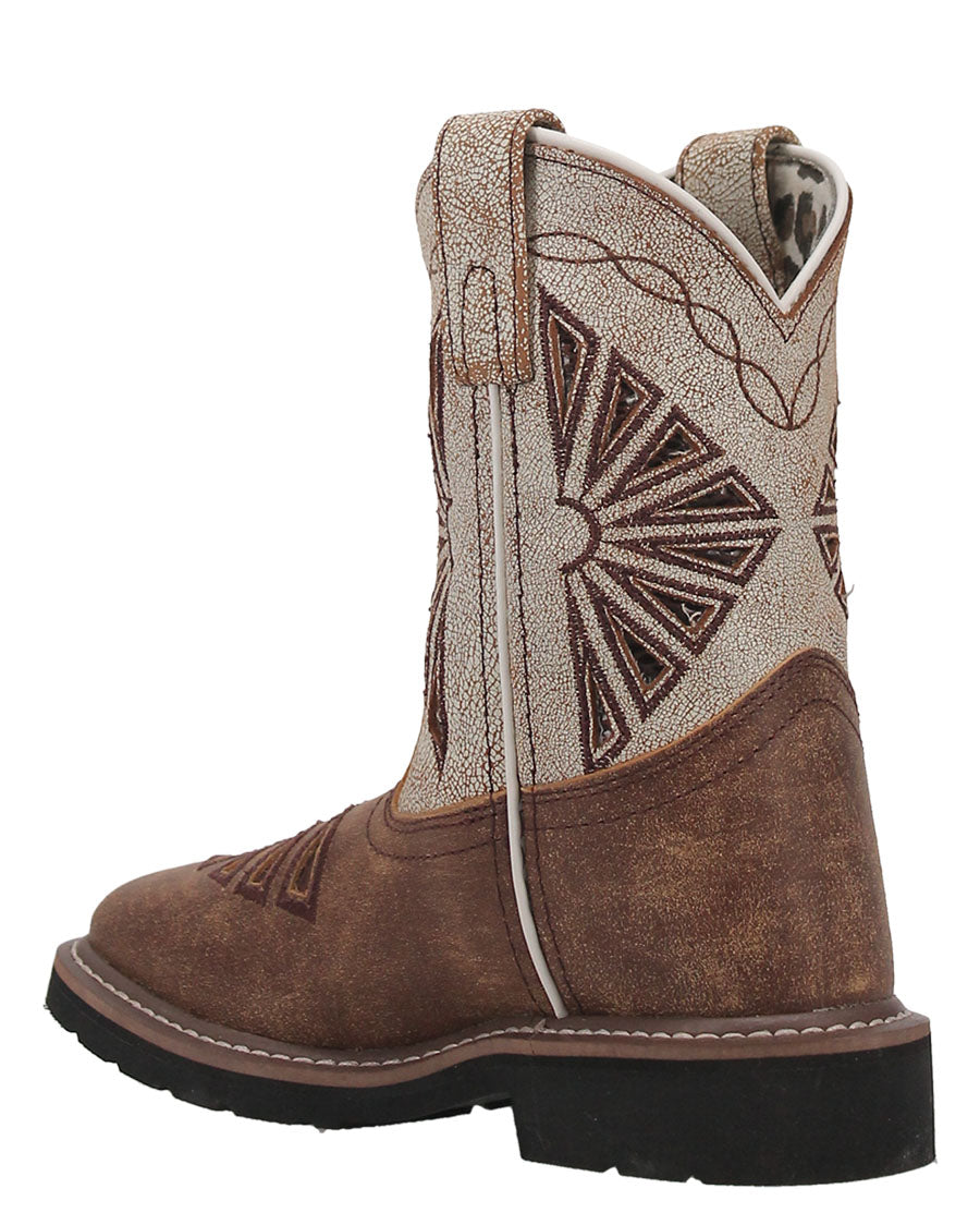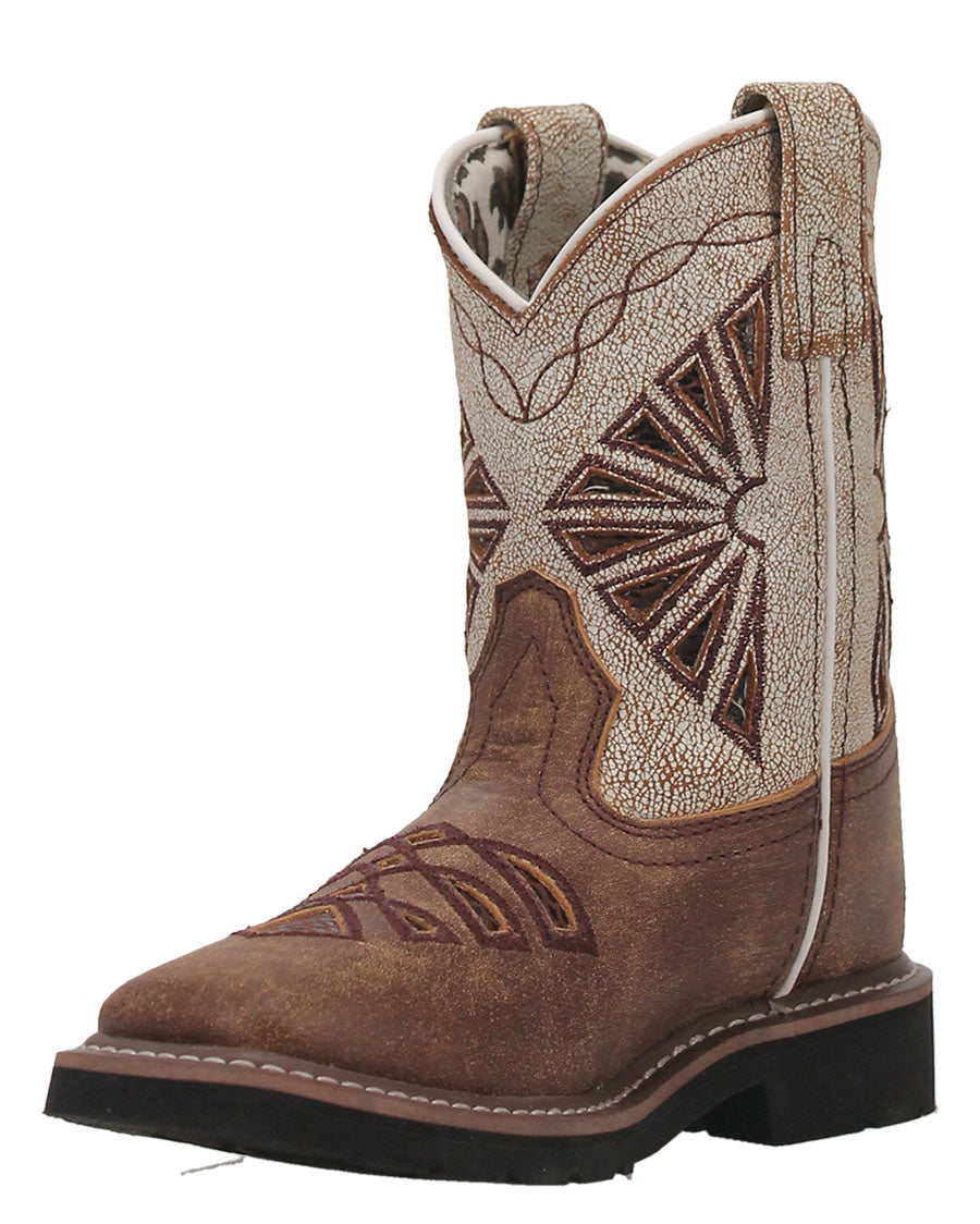 The Kite Days features fancy kite inspired embroidery on the foot and upper. The upper leather is aged white leather. Features broad square toe, stockman heel and long-wearing rubber outsole.