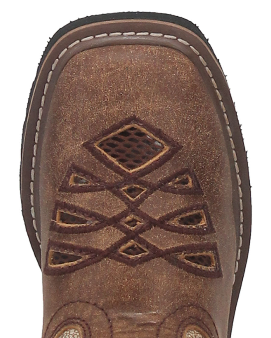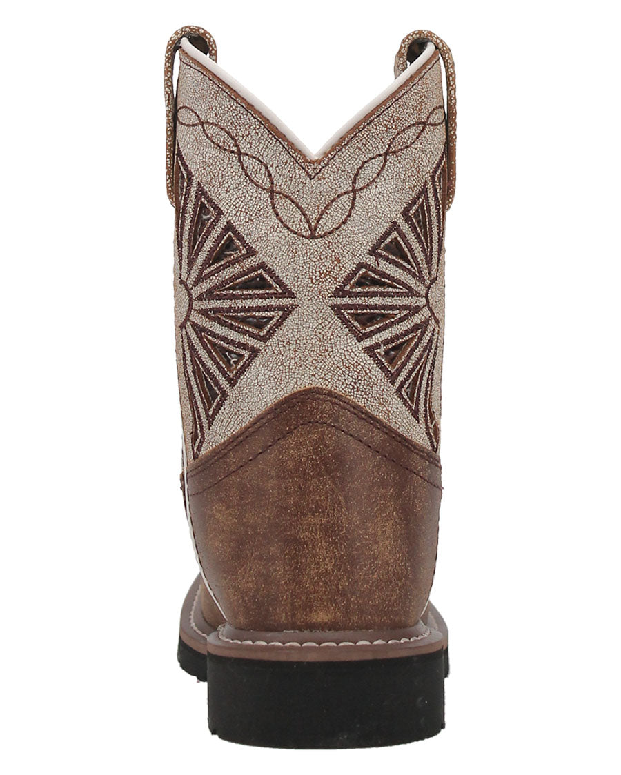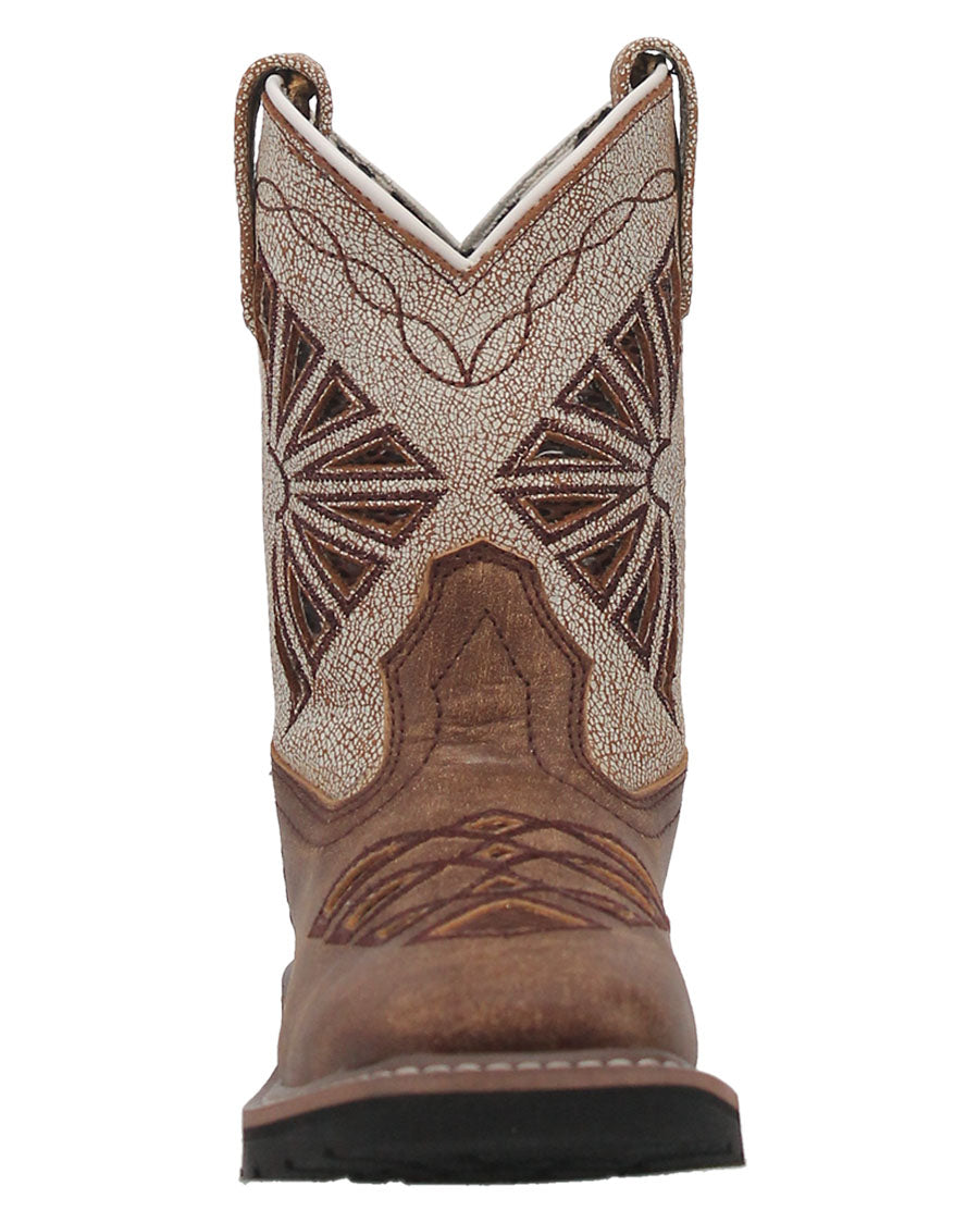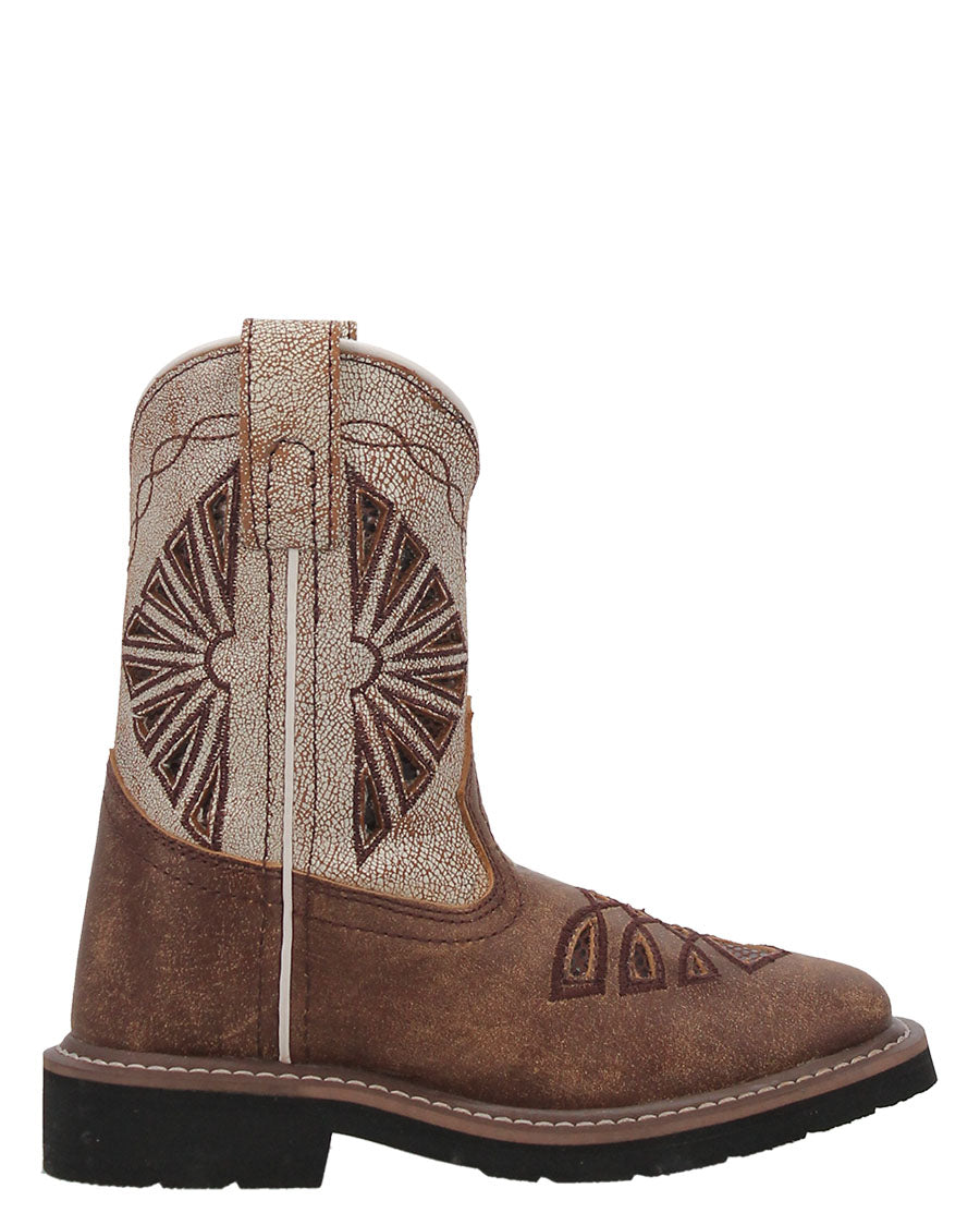 The Kite Days features fancy kite inspired embroidery on the foot and upper. The upper leather is aged white leather. Features broad square toe, stockman heel and long-wearing rubber outsole.