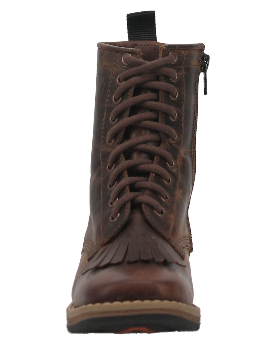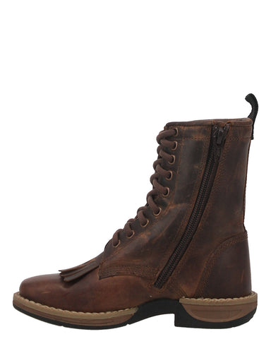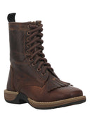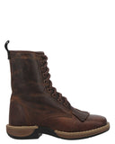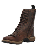 The Rowan is a winner straight out of the box. Sturdy leather lace boot with side zipper for easy on and off. No need to unlace every time. Non-marking outsole. Removable kiltie. Broad square toe.