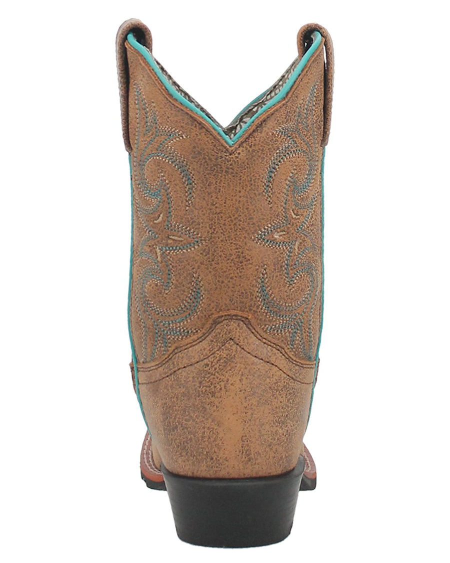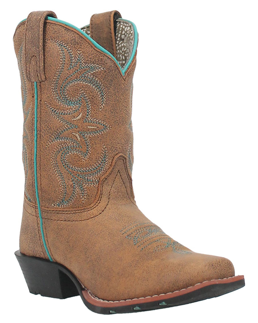 The Laredo Sadie Mae cowboy boot is cute,colorful and looks like Mom's Sadie boots. All over leather and accented with turquoise multi-row stitch pattern. Long wearing TPR outsole. Broad square toe and stockman heel. Matching boots for Mom and child.