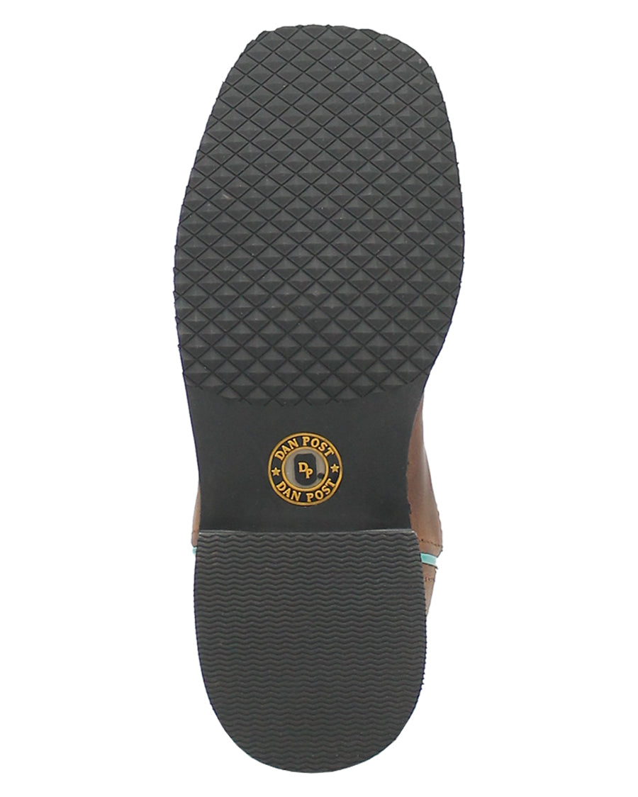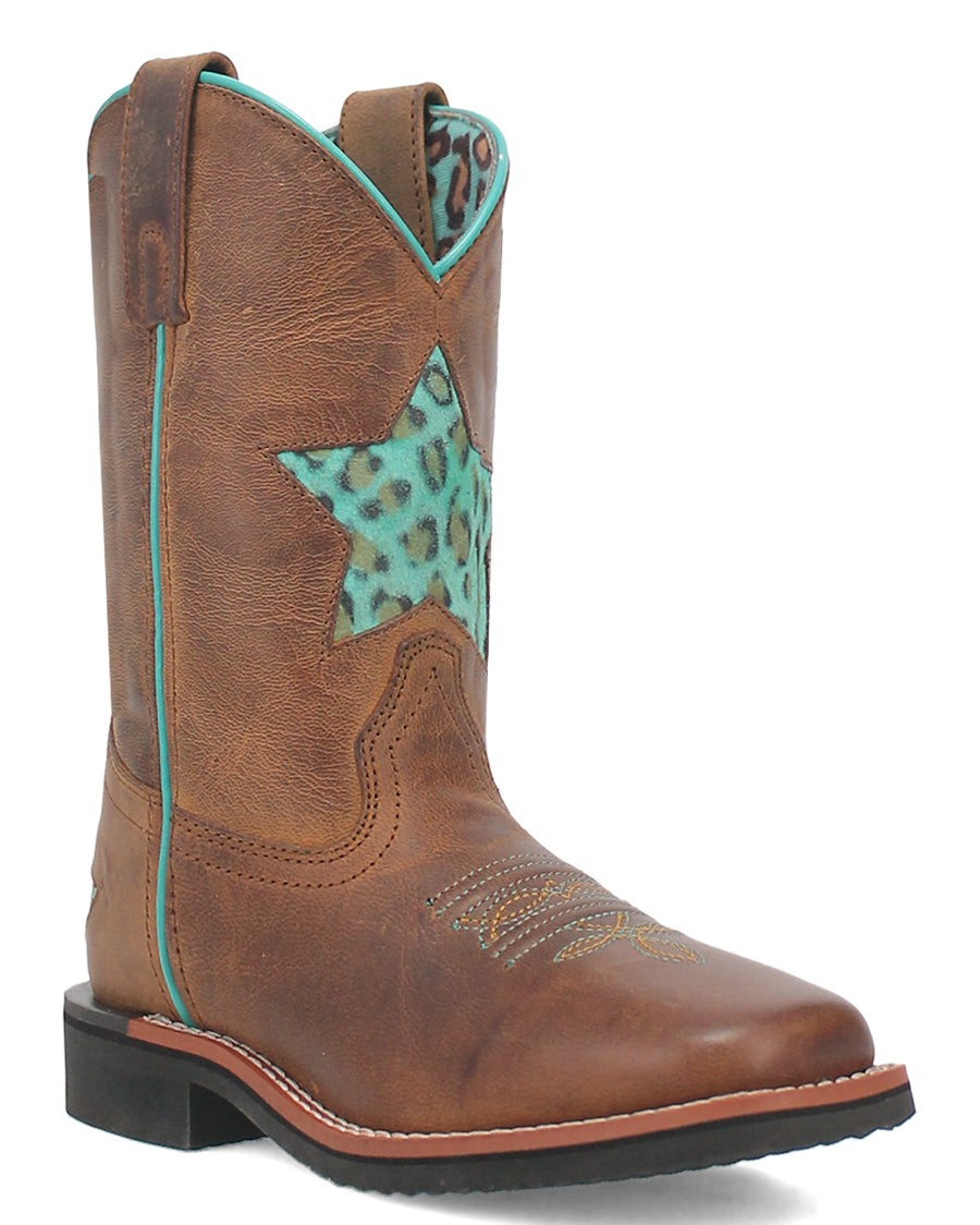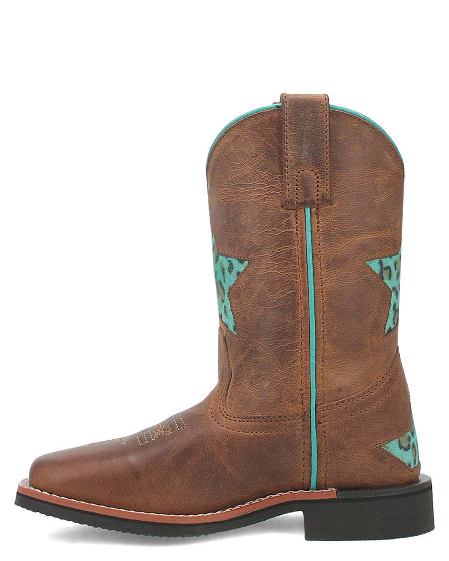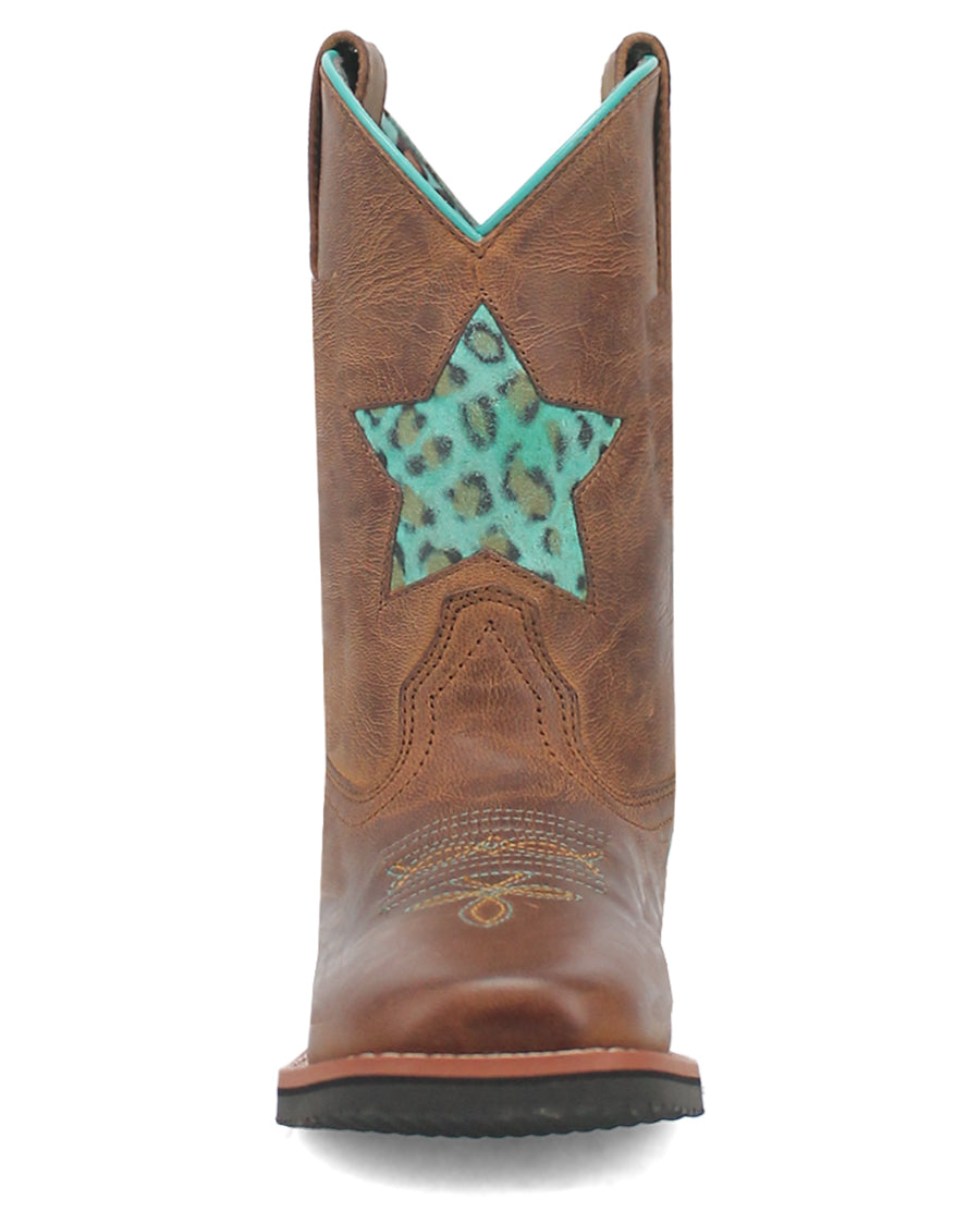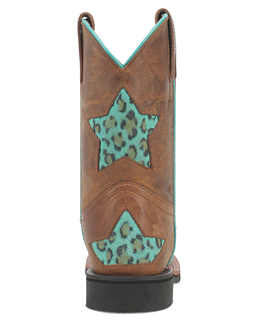 Shoot for the stars wearing the Starr boot from Dan Post. This 8- inch kids boot is adorned with turquoise cheetah print inlay star design on the shaft, featuring removable cushion orthotic, broad square toes, and stockman heel. Let your little one's style shine bright in these spunky boots.