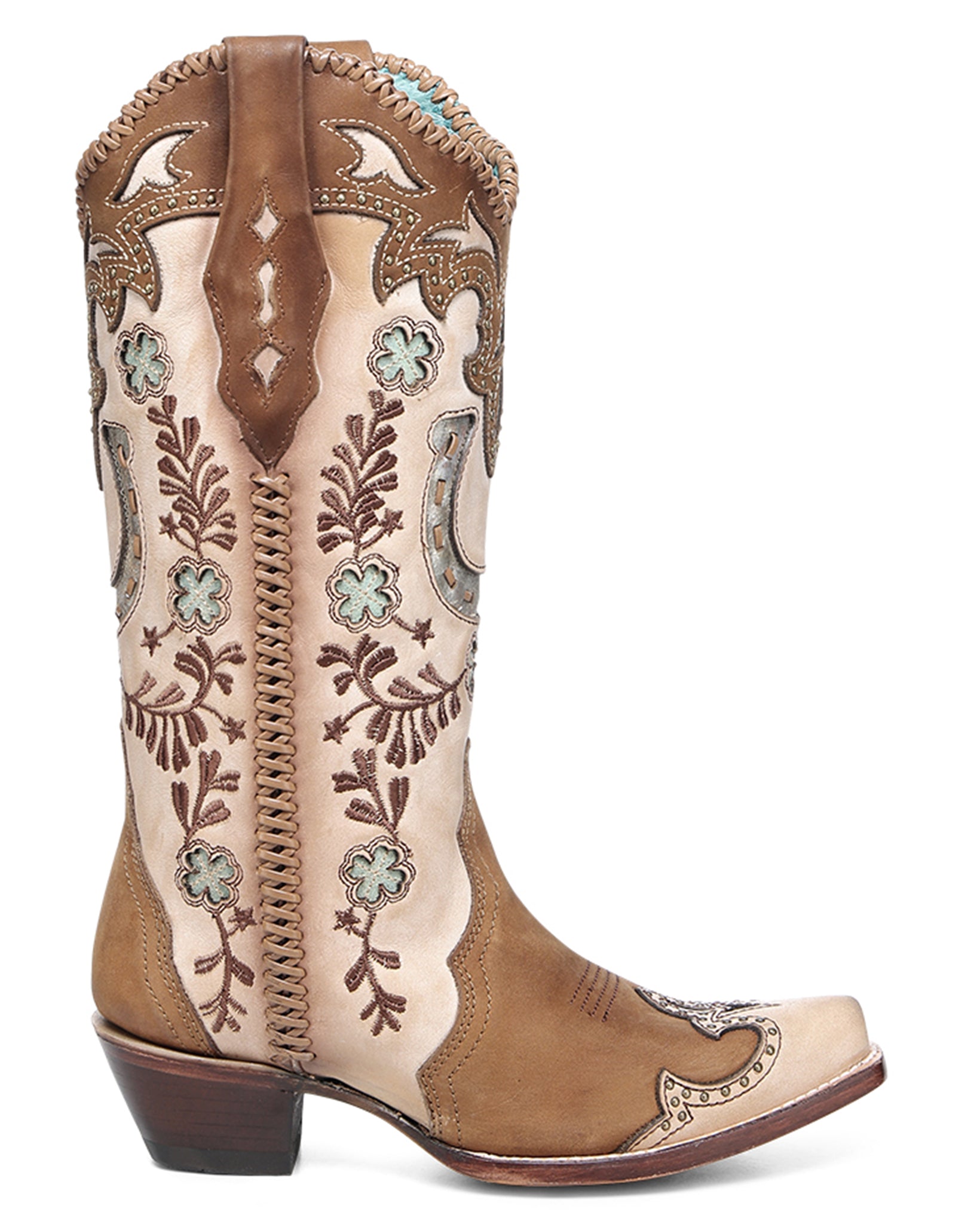 Chic, feminine, and stylish. The floral embroidery along the boot and the horse shoe design gives it that cute western look.