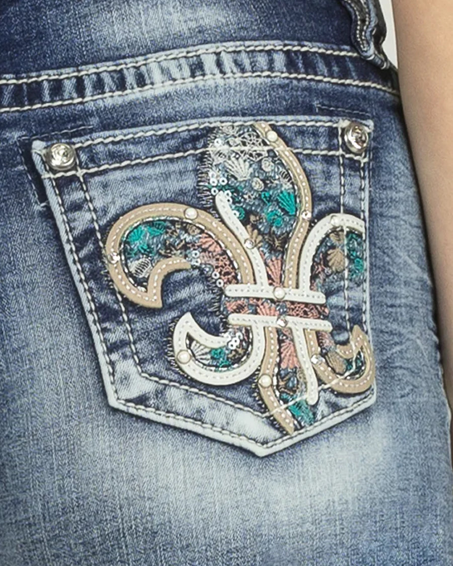Mid-rise, medium wash denim shorts. Back pocket features embroidered fleur-de-lis design with two-toned leather outlining and multicolor stitched patterns. Embroidery features various beachy seashells and starfishes. Sequin and rhinestone rivet detailing. Leather patch features embossed cross design and M logo. Hemmed shorts with slight distressing on front.