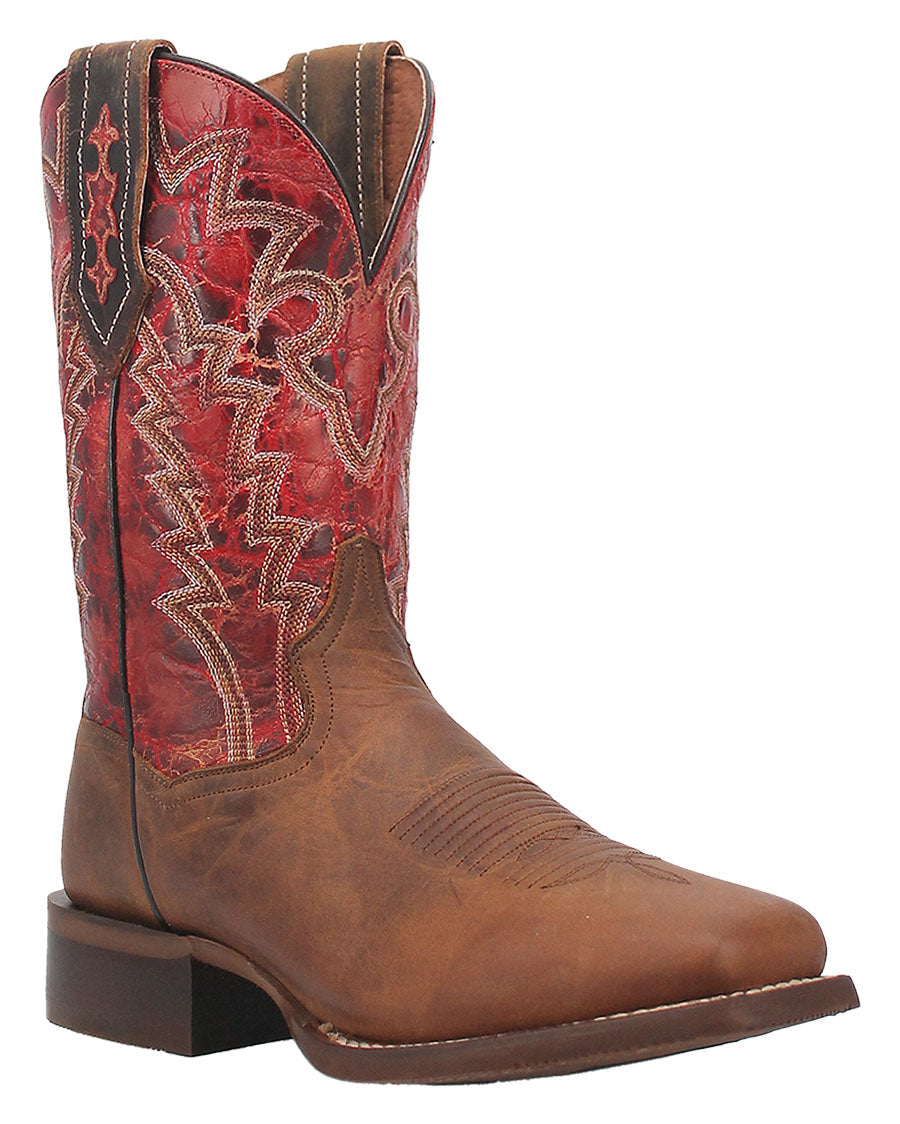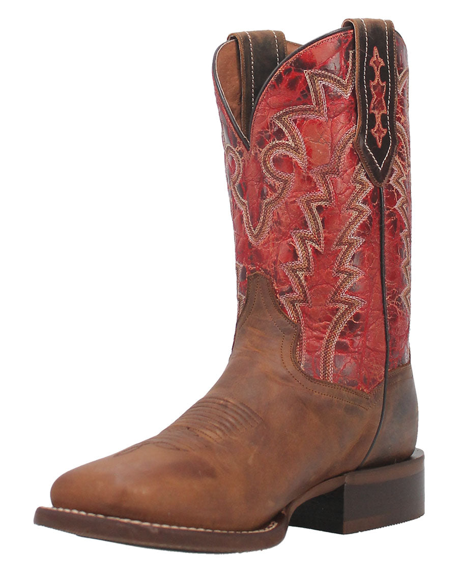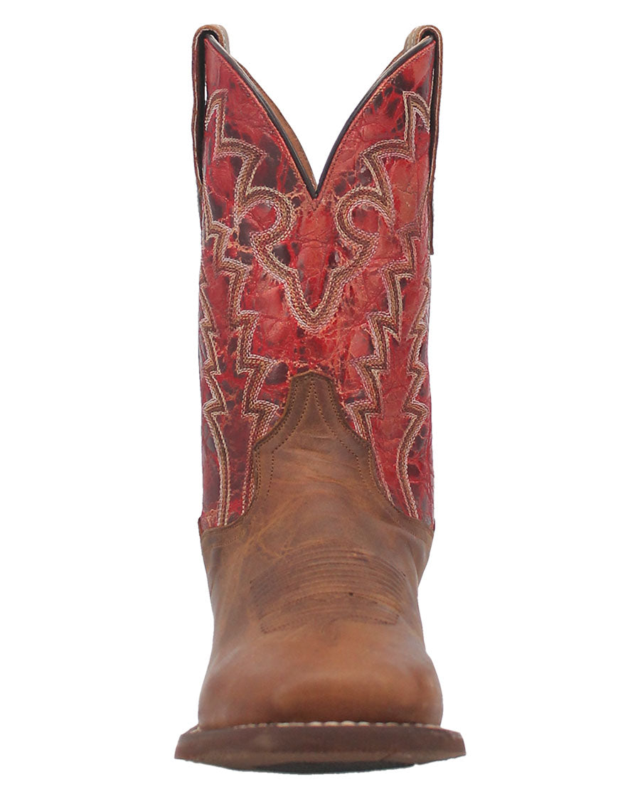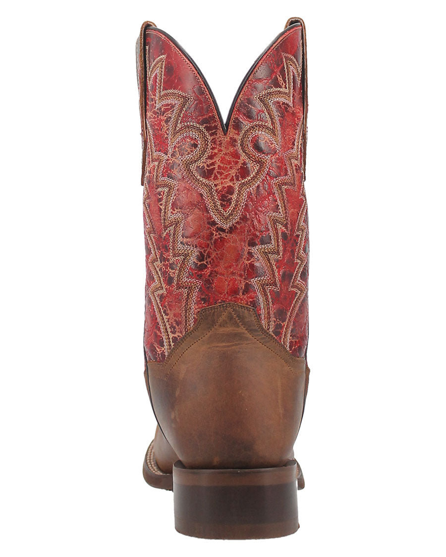 The tan leather foot of the Dan Post Killeen boot is contrasted with a mottled red leather upper. Features popular broad square toe, stockman heel and long-wearing Avenger rubber outsole.