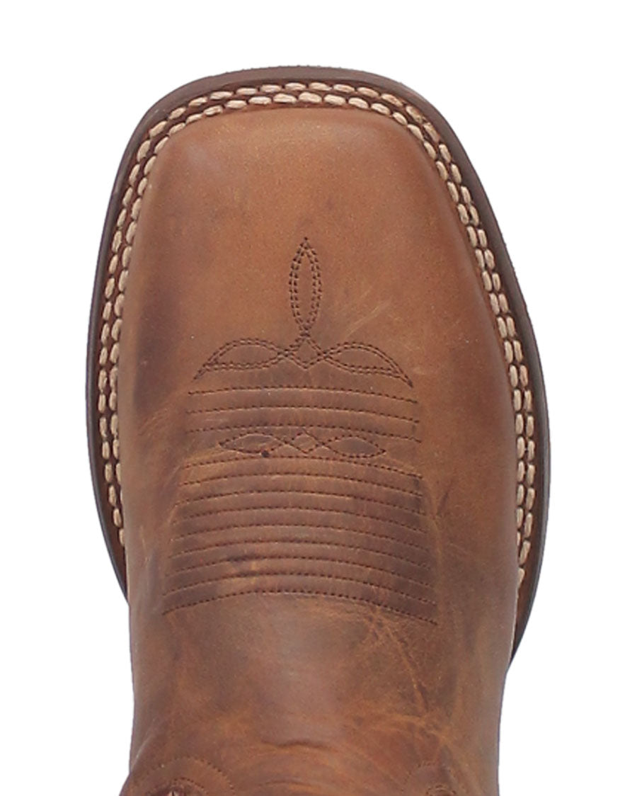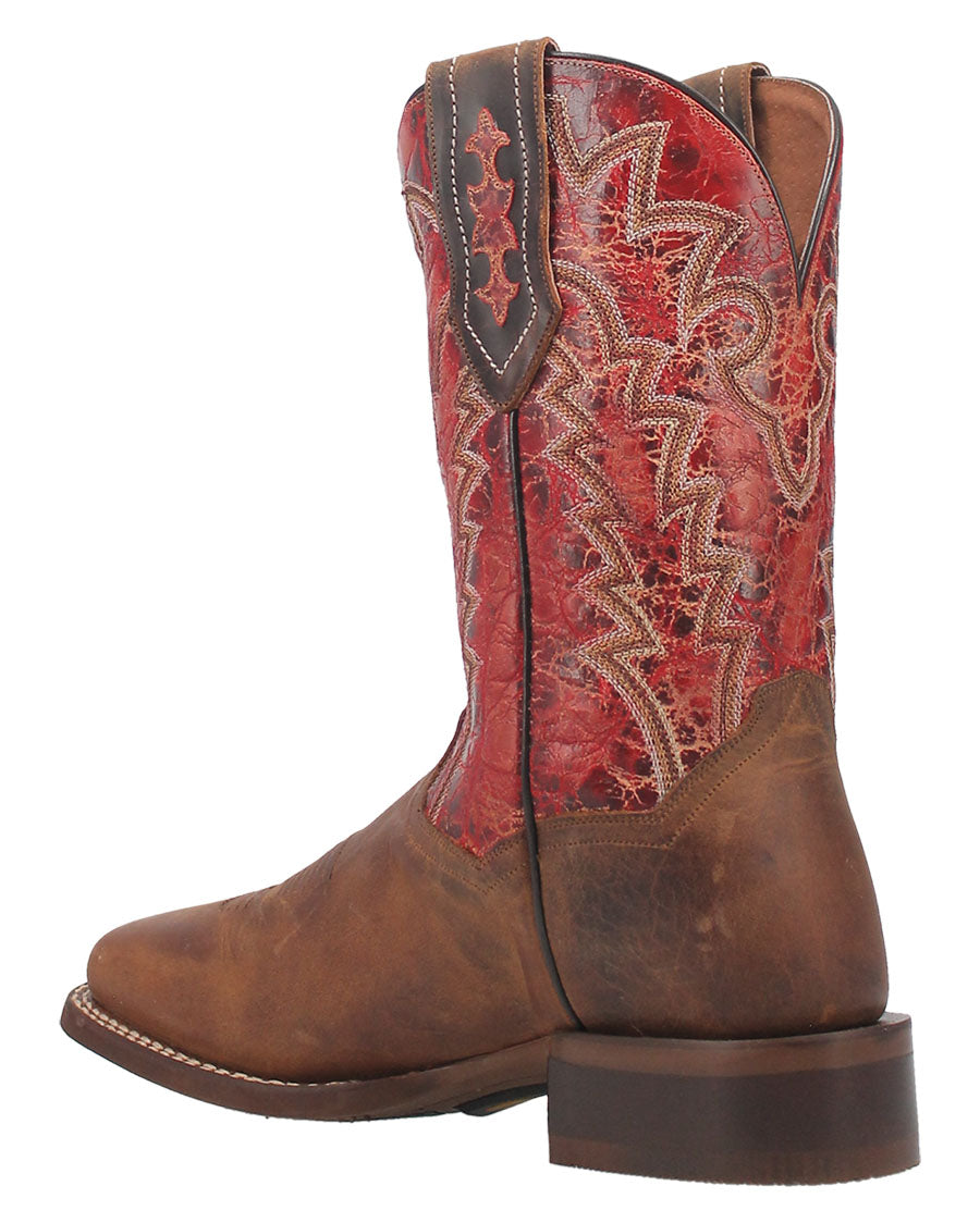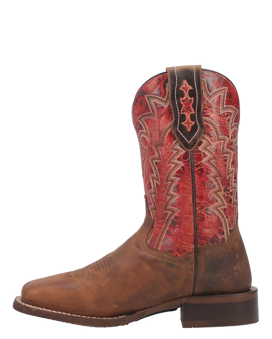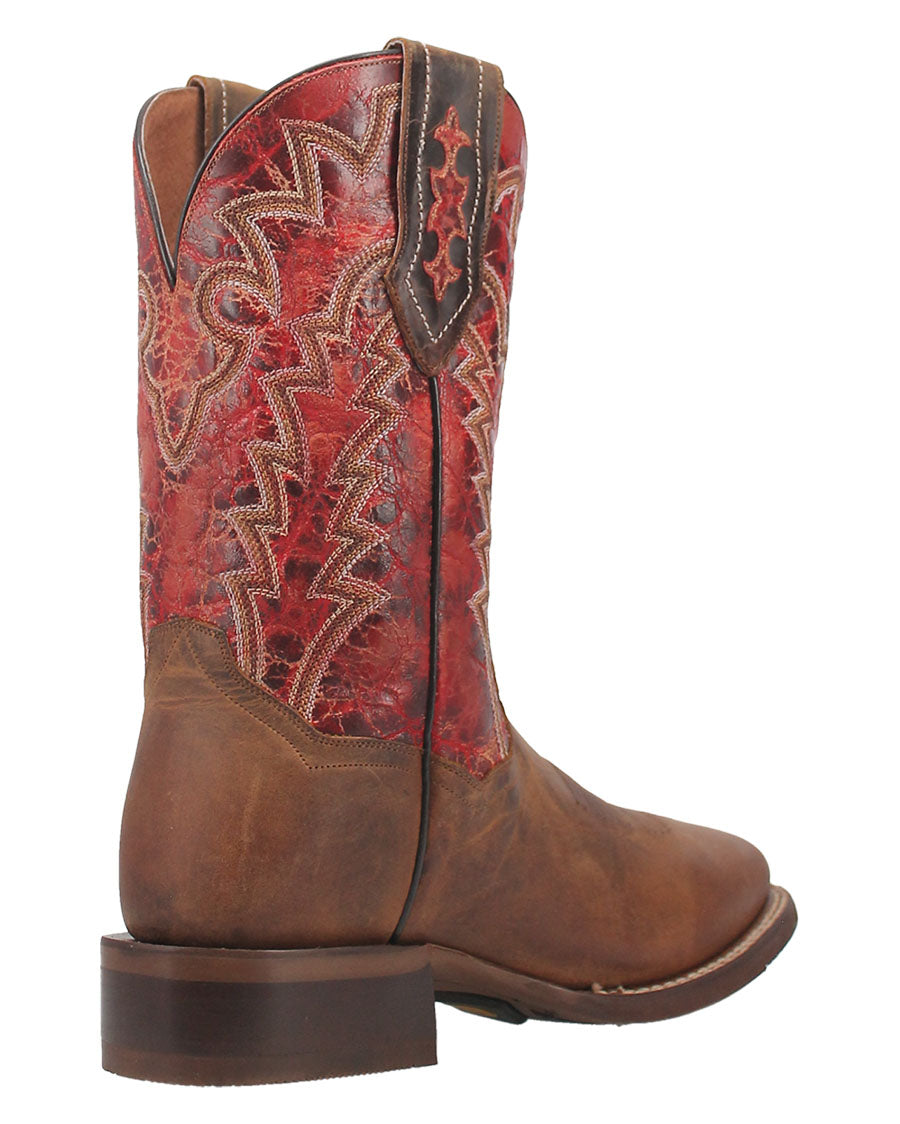 The tan leather foot of the Dan Post Killeen boot is contrasted with a mottled red leather upper. Features popular broad square toe, stockman heel and long-wearing Avenger rubber outsole.