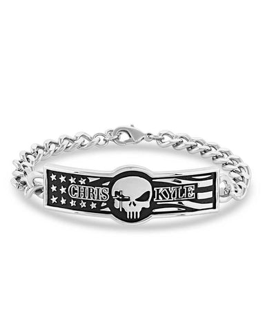 Chris Kyle-inspired linked bracelet with a black-painted tag that is scalloped in shape. Within that tag are the words "Chris Kyle" accompanied by a sniper skull and American flag print in the background. The linked chain is silver-toned with a square clasp to keep it secure.